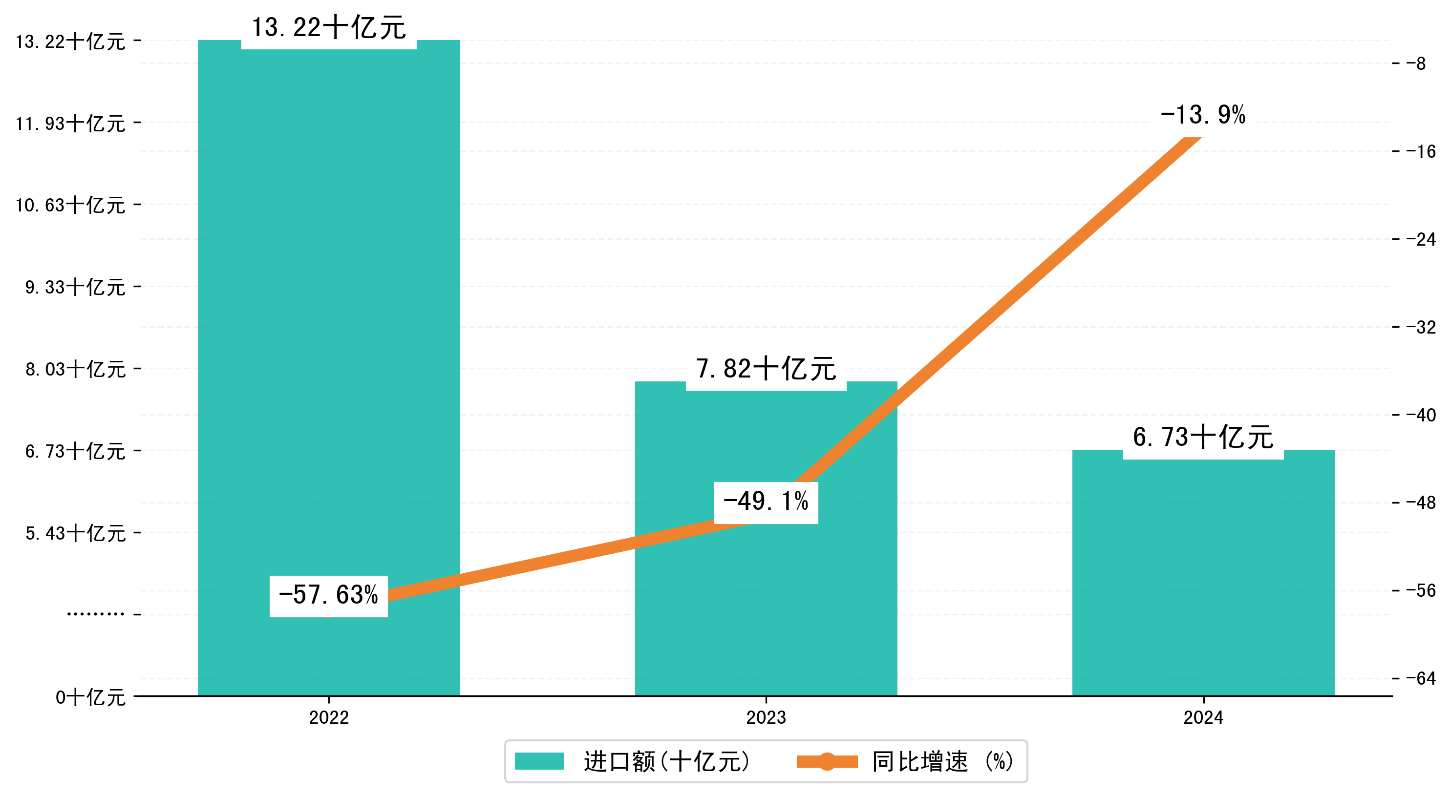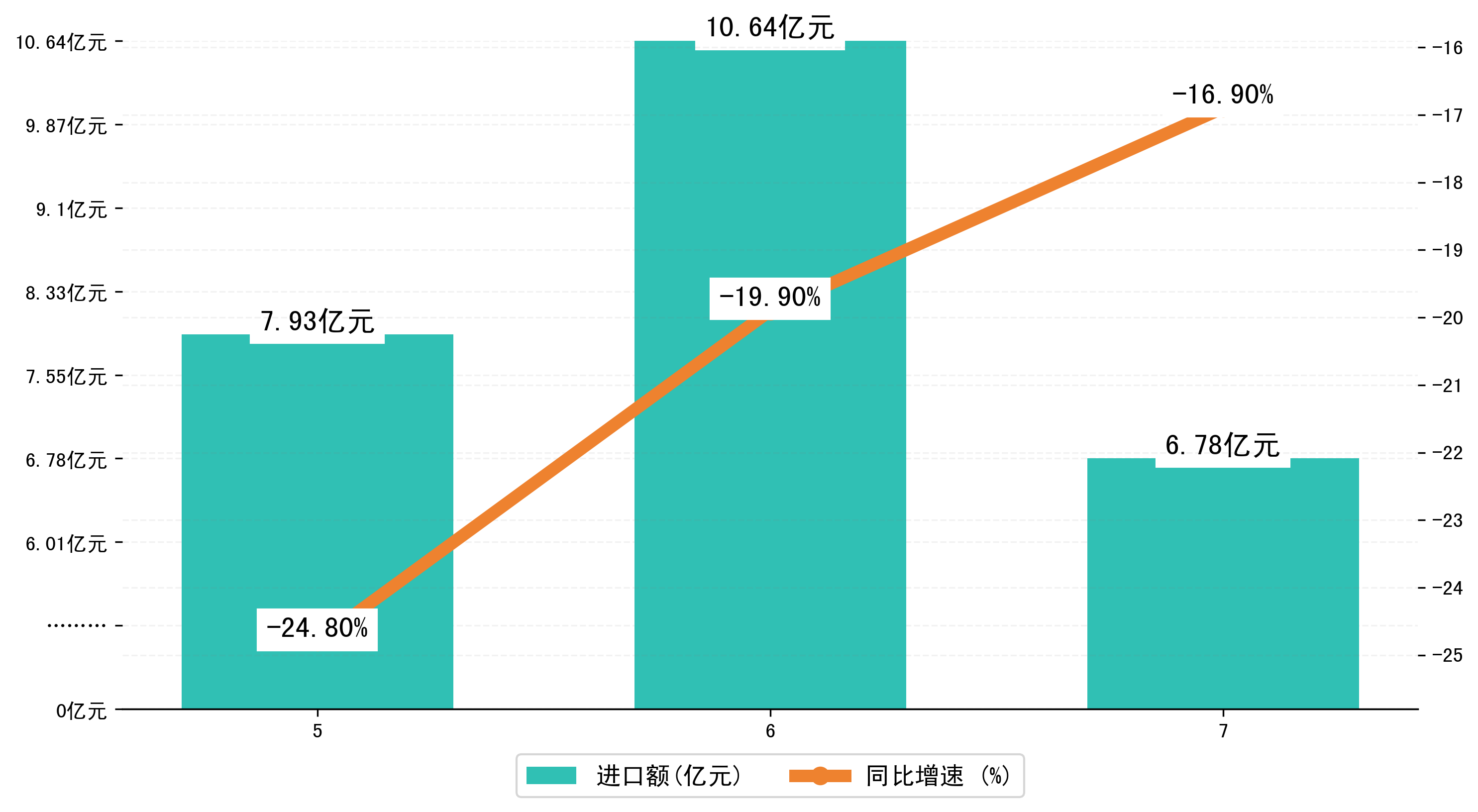 以人民币计,2024年1-7月鞍山市进口额为67,3050.0122万元,相比上年同期减少了10,8638.8757万元,同比减少了-16.90%。