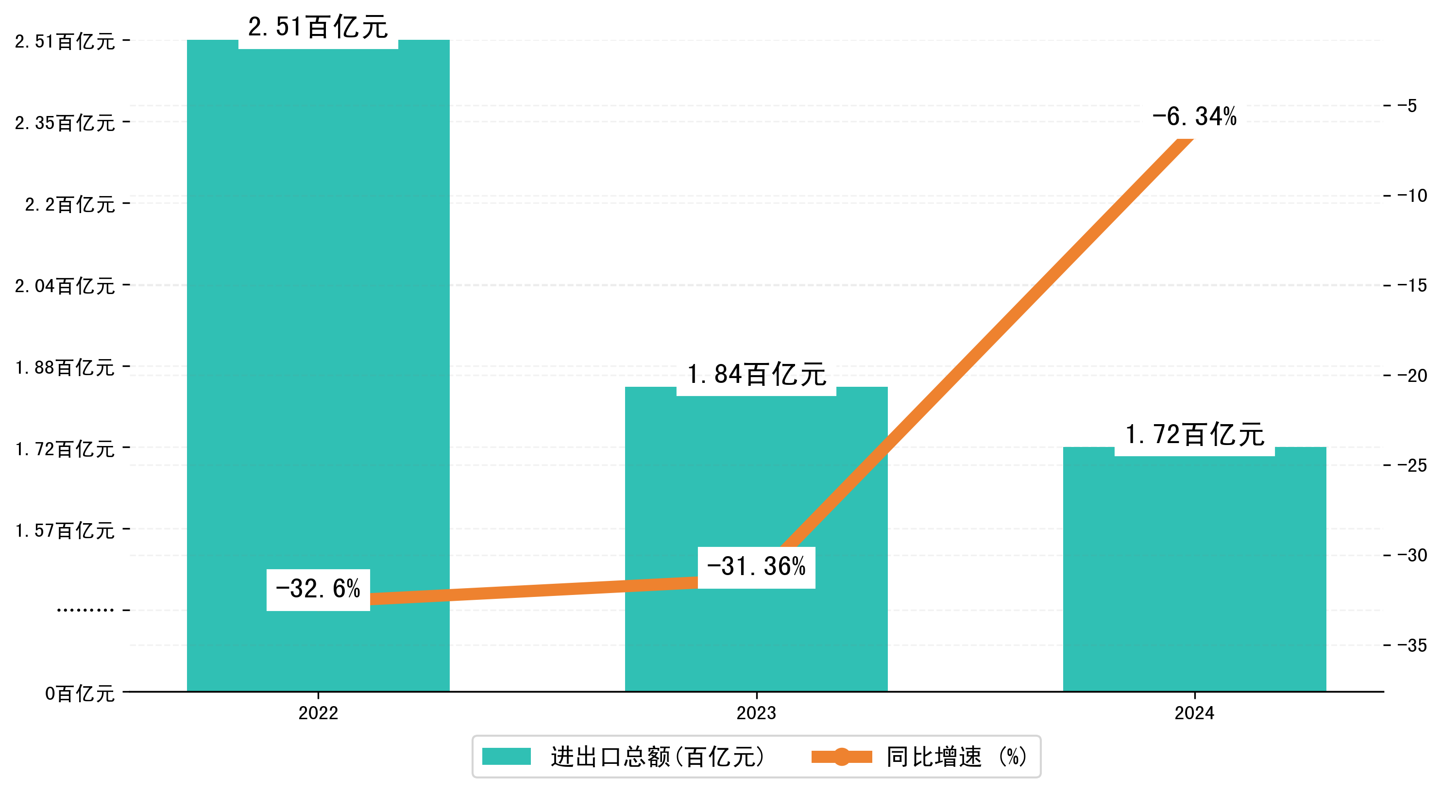 以人民币计,2024年1-7月鞍山市进出口总额为172,3578.9421万元,相比上年同期减少了11,6683.9553万元,同比减少了-7.80%。