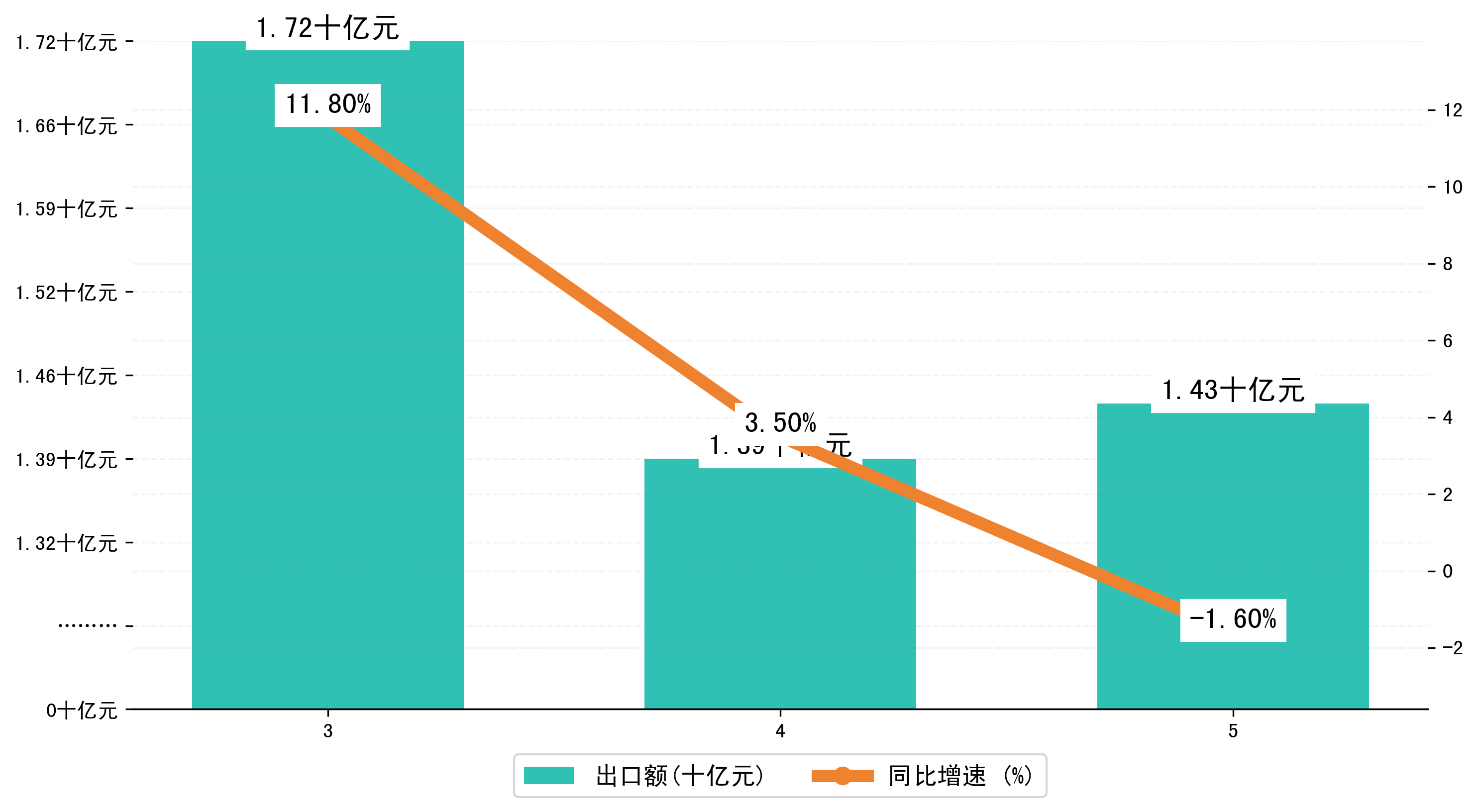以人民币计,2024年5月鞍山市出口额为14,3381.9546万元,相比上月增加了4379.7106万元;相比上年同期减少了3,2598.7494万元,同比减少了-1.60%。