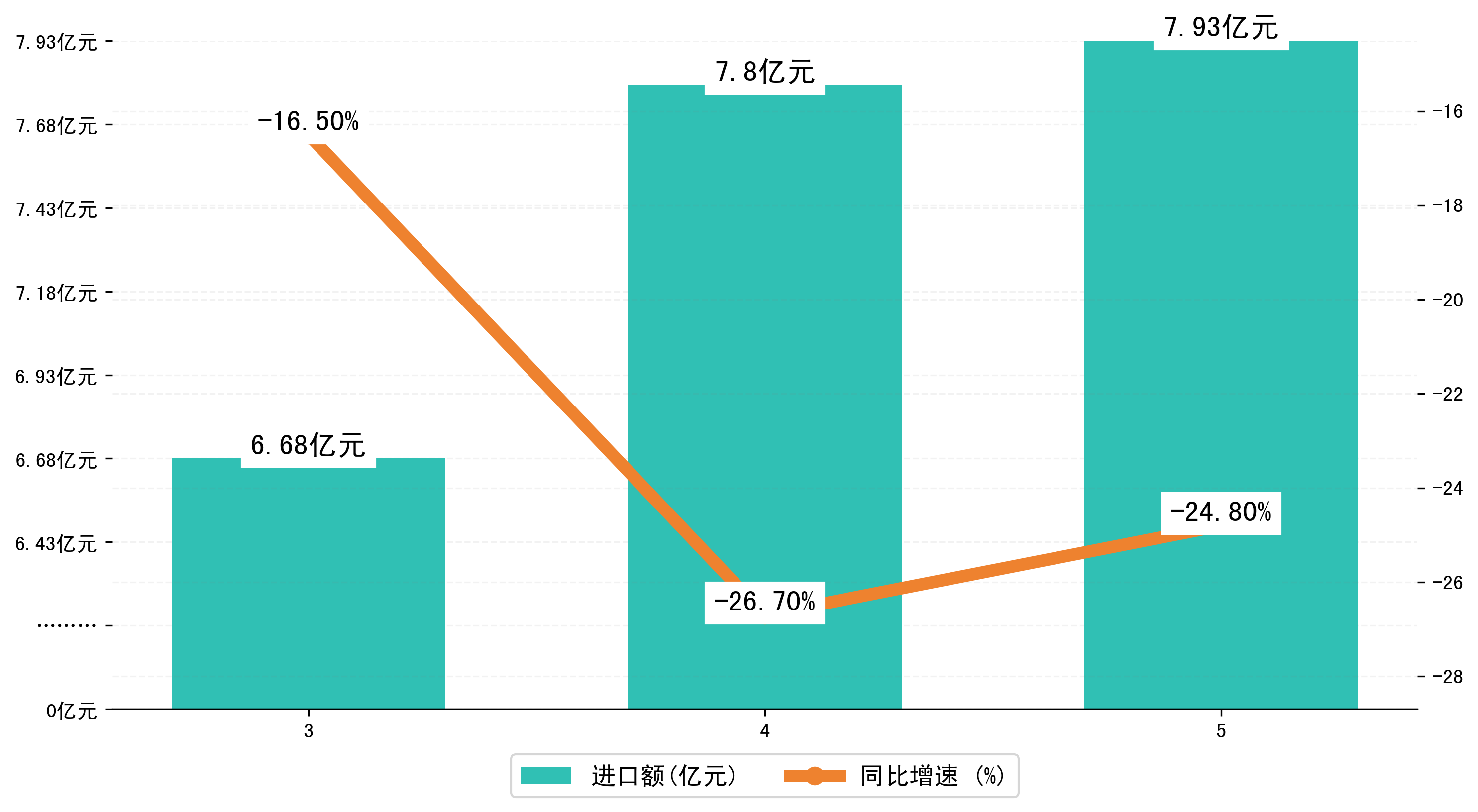 以人民币计,2024年5月鞍山市进口额为7,9279.6065万元,相比上月增加了1319.1775万元;相比上年同期减少了1,0103.3895万元,同比减少了-24.80%。