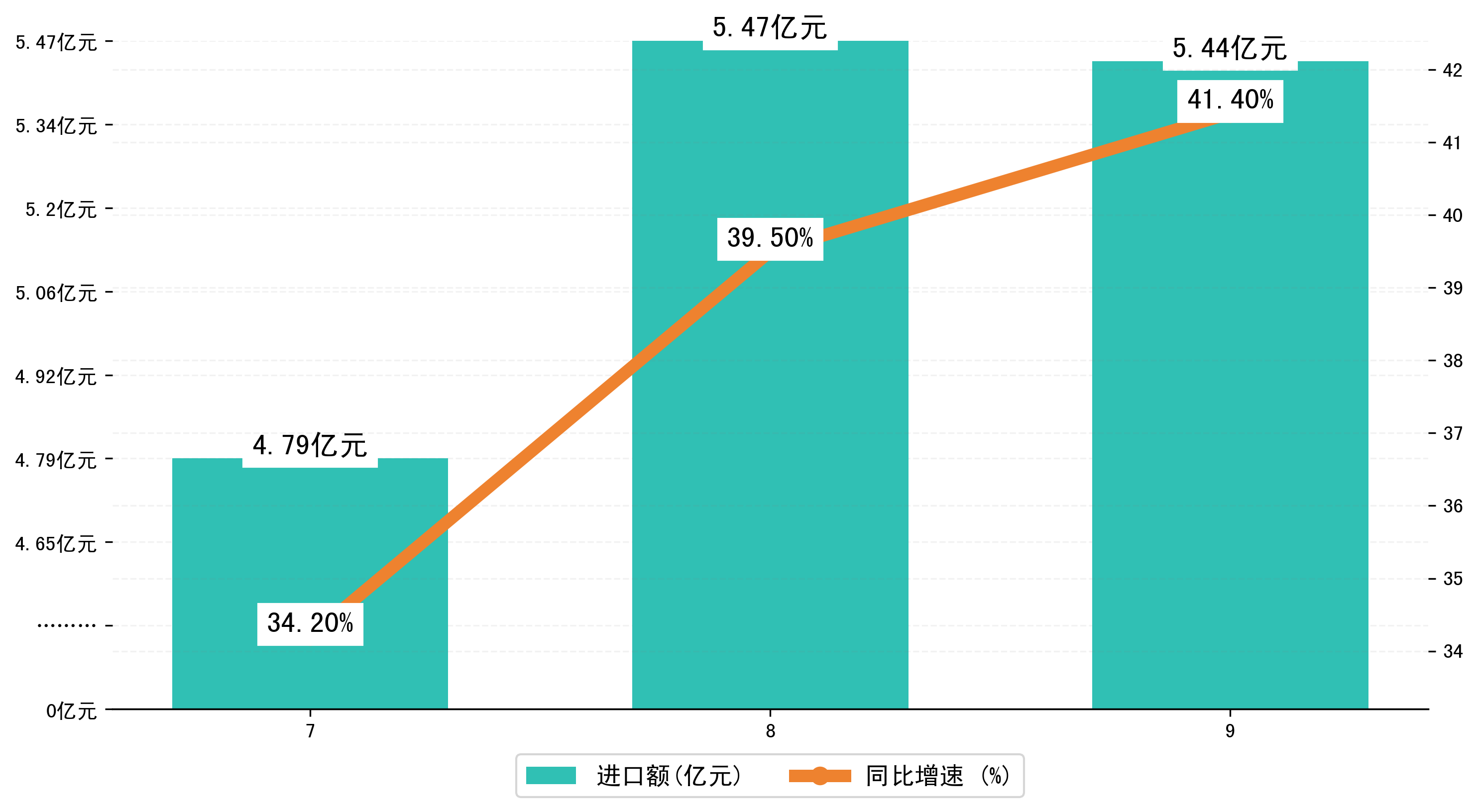 以人民币计,2023年9月保定市进口额为5,4392.9588万元,相比上月减少了341.5292万元;相比上年同期增加了1,9013.9616万元,同比增加了41.40%。