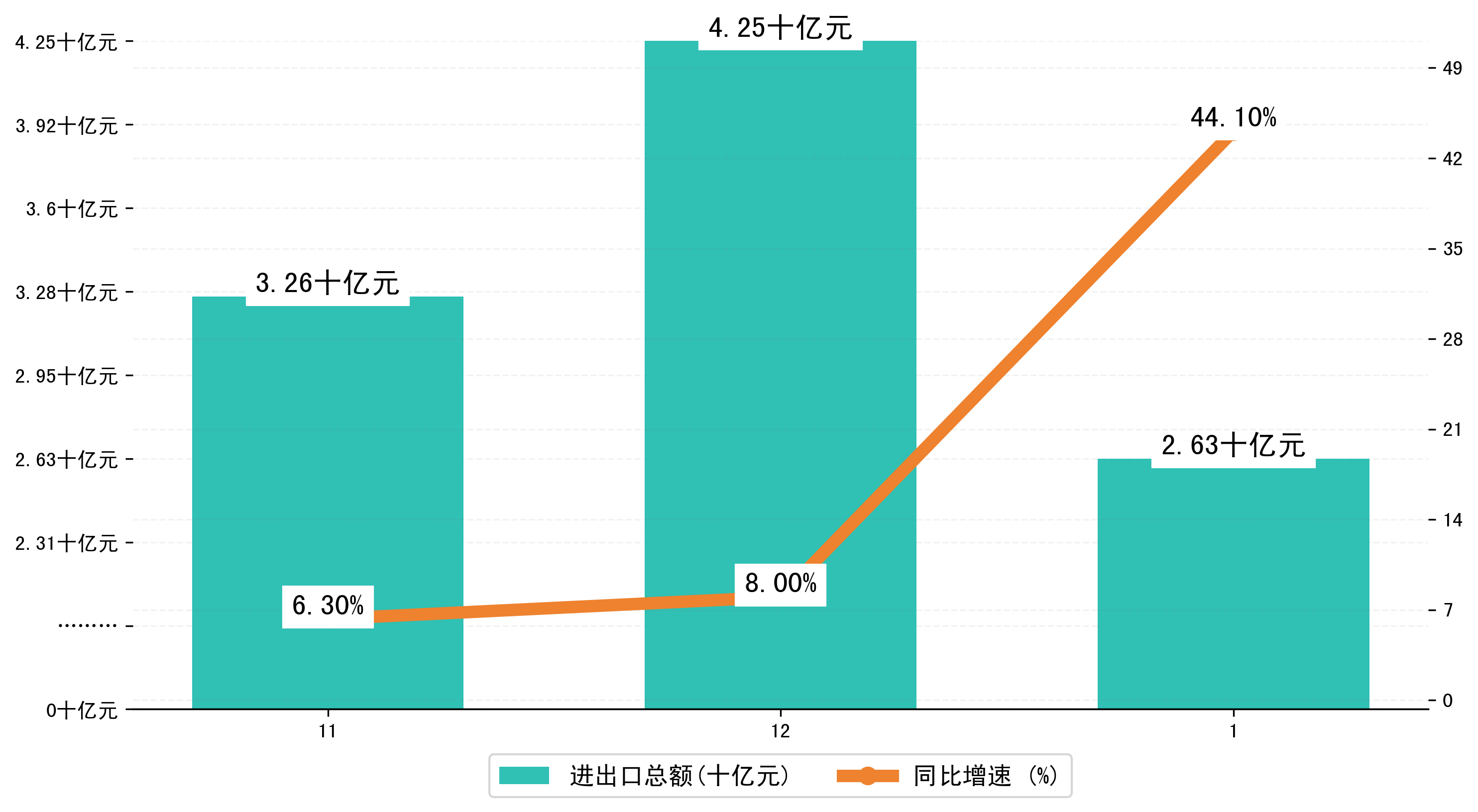 以美元计,2024年1-1月北海市进出口总额为3,6903.9679万美元,相比上年同期增加了6375.3964万美元,同比增加41.00%。