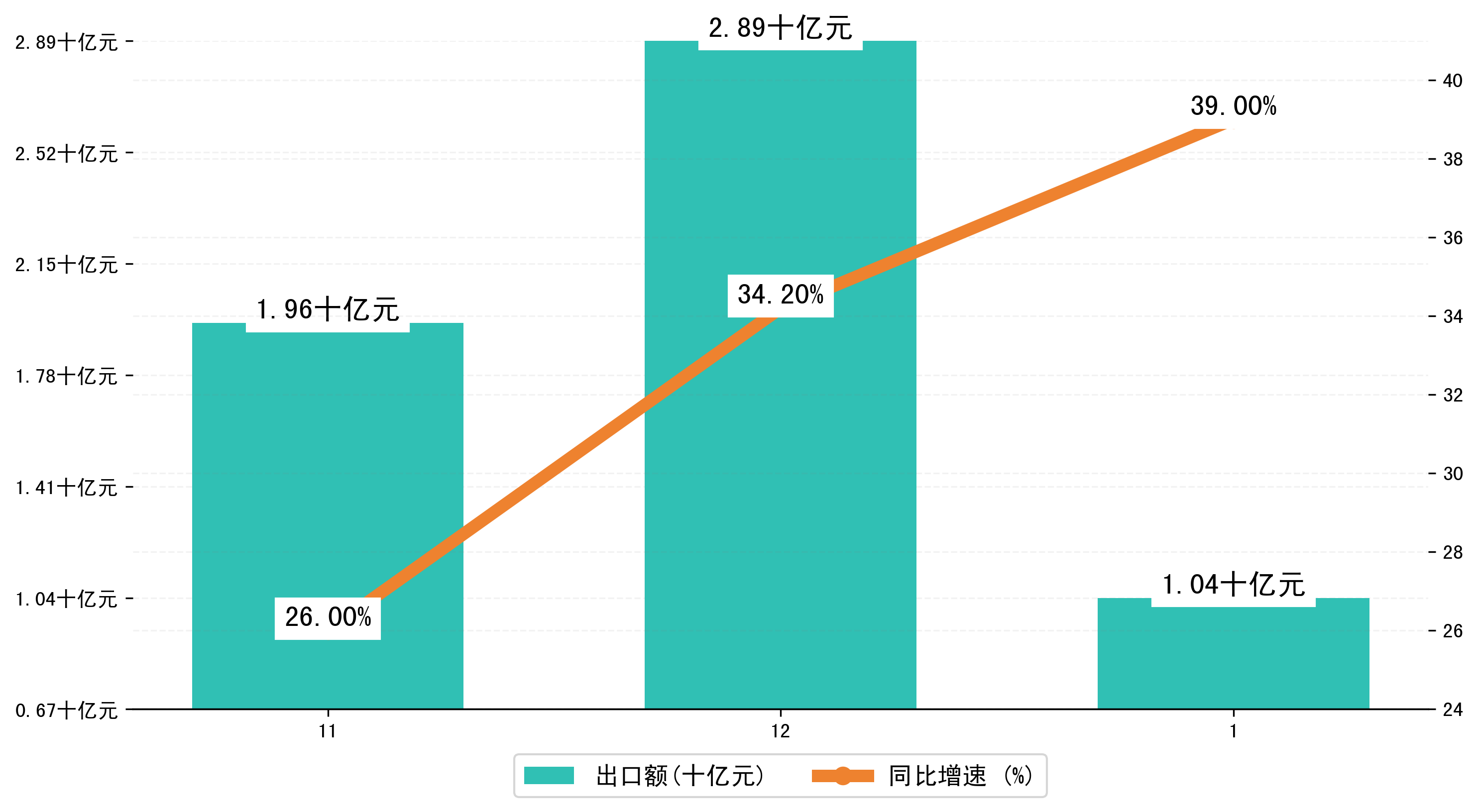 以美元计,2024年1-1月北海市出口额为1,4617.9595万美元,相比上年同期增加了1604.8703万美元,同比增加36.30%。