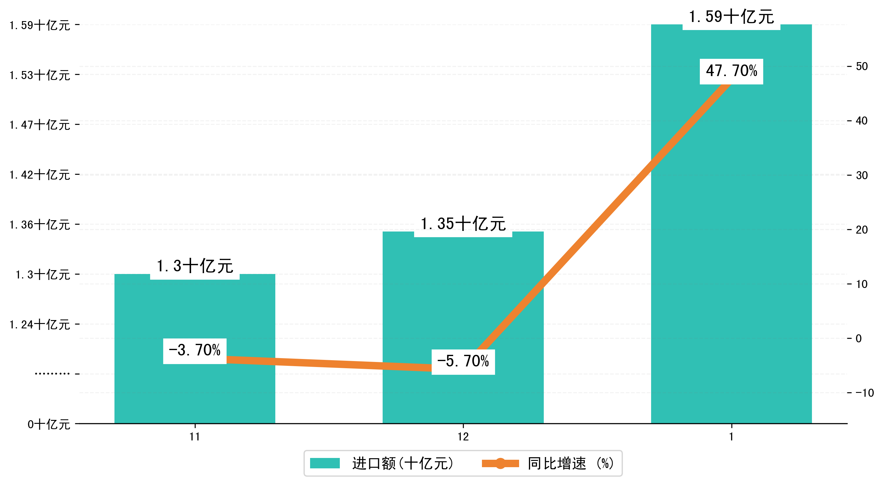 以人民币计,2024年1月北海市进口额为15,8984.9334万元,相比上月增加了2,3926.4312万元;相比上年同期增加了3,6760.7351万元,同比增加了47.70%。
