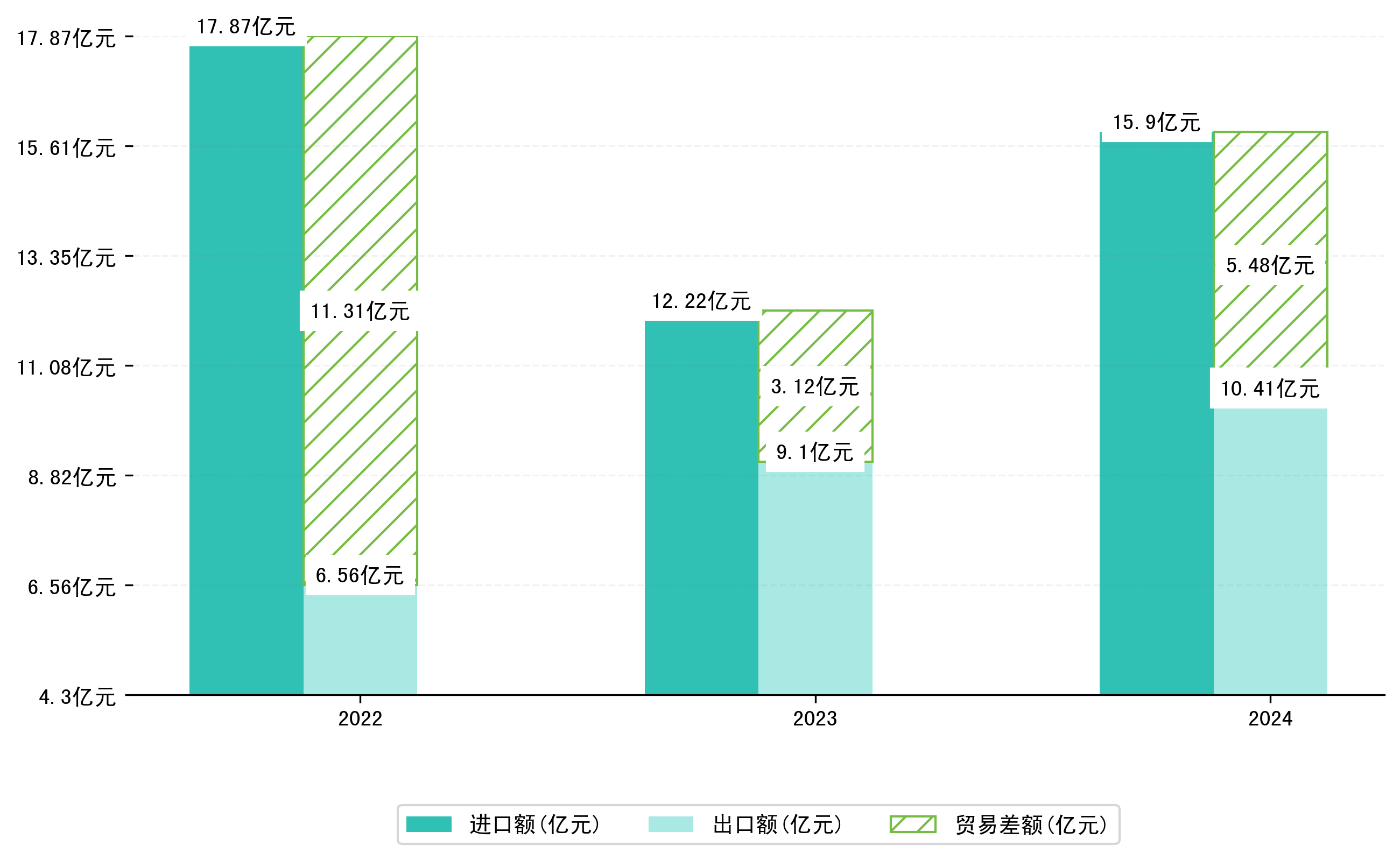 以人民币计,2024年1月北海市贸易差额为5,4837,9250万元(贸易逆差),相比上月减少了20,9248,8431万元,即2,9290,3148万美元;相比上年同期减少了2,3635,8023万元,同比减少75.75%。