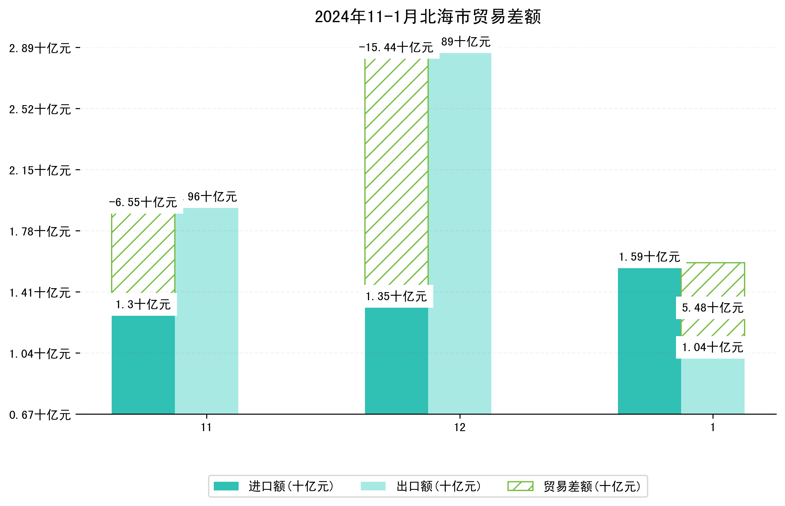 以人民币计,2024年1-1月北海市贸易差额为5,4837,9250万元(贸易逆差),相比上年同期减少了2,3635,8023万元,同比减少75.75%。