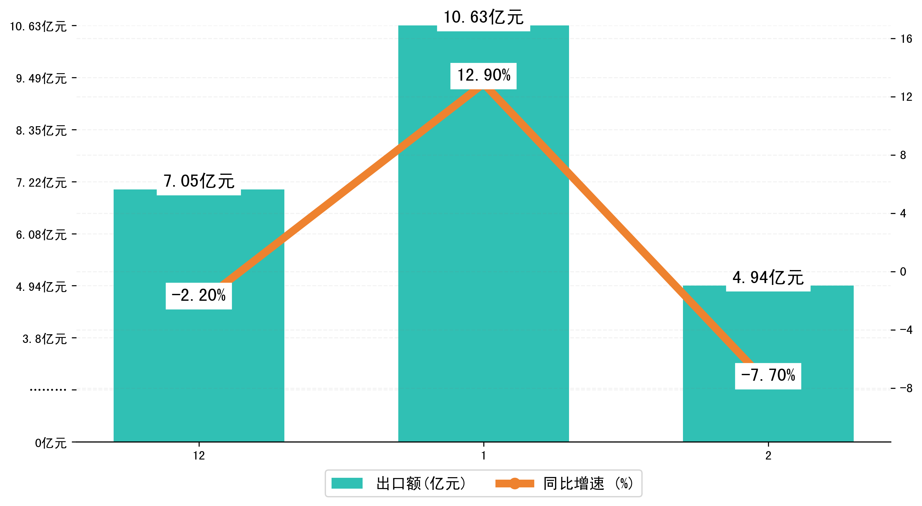 以人民币计,2024年1-2月蚌埠市出口额为15,5702.9209万元,相比上年同期减少了1,7393.4934万元,同比减少了-7.70%。