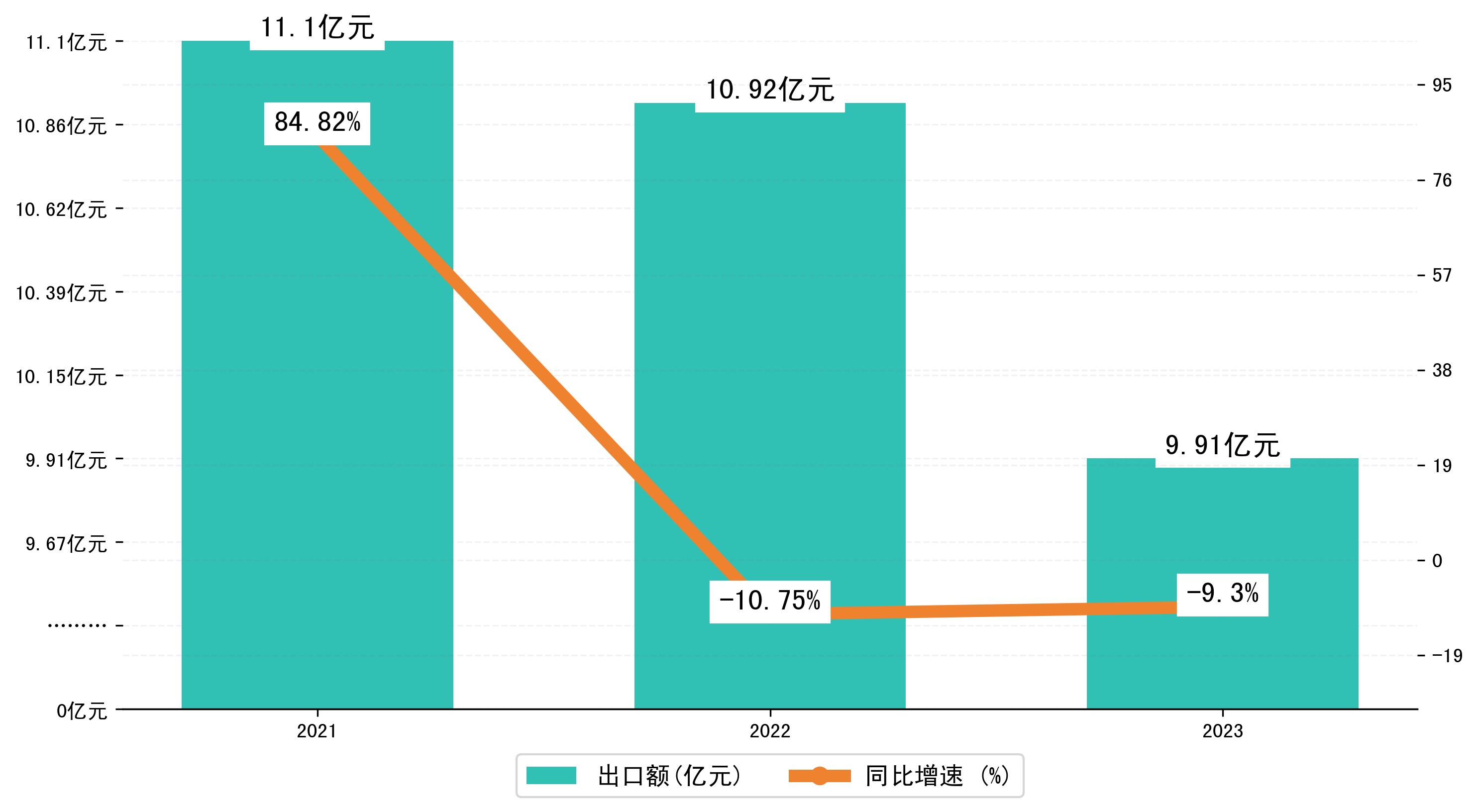 以人民币计,2023年1-10月长治市出口额为9,9076.2127万元,相比上年同期减少了1,0161.6868万元,同比减少了-9.30%。