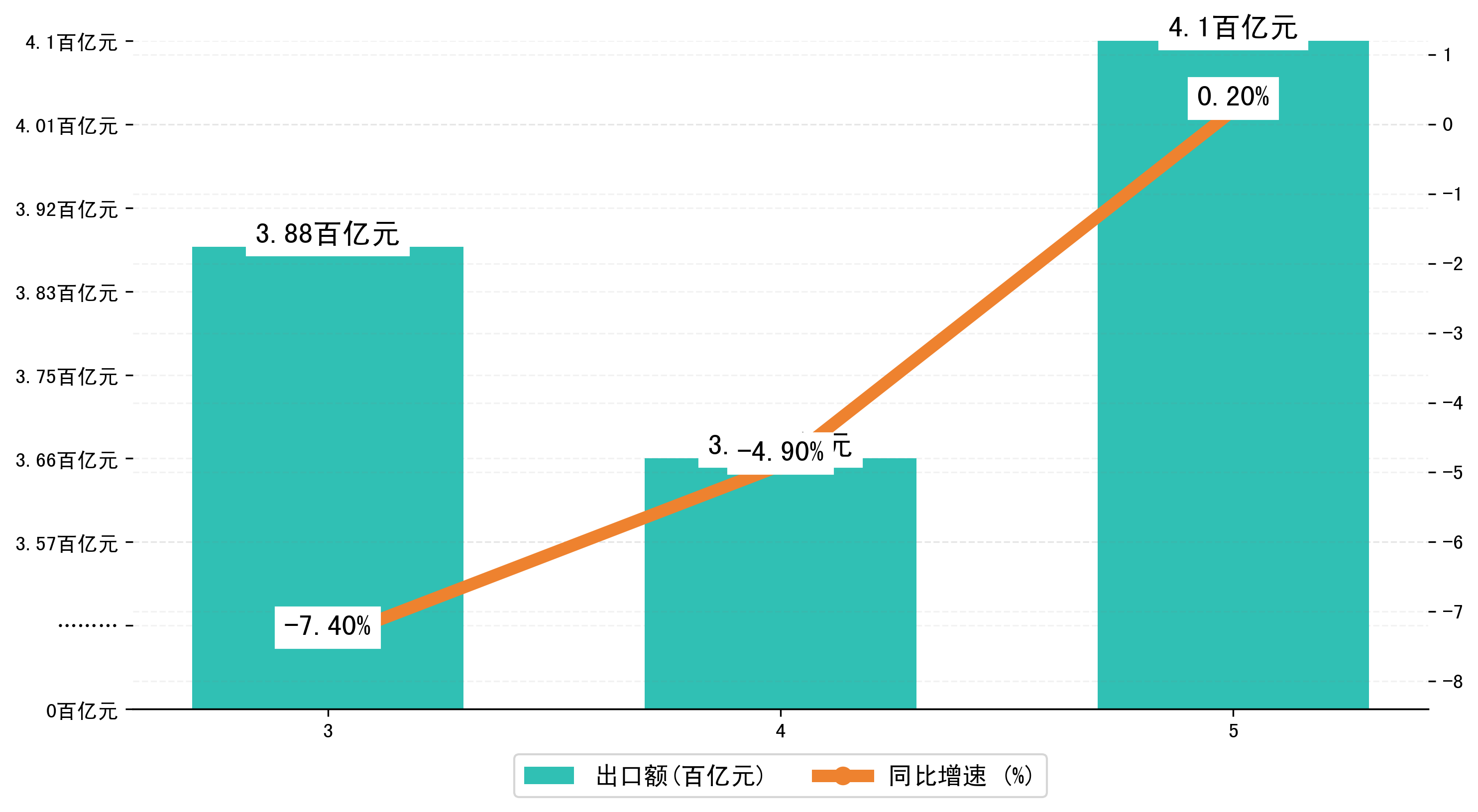 以人民币计,2023年5月成都市出口额为409,5411.1569万元,相比上月增加了43,4633.1855万元;相比上年同期增加了82,6060.659万元,同比增加了0.20%。