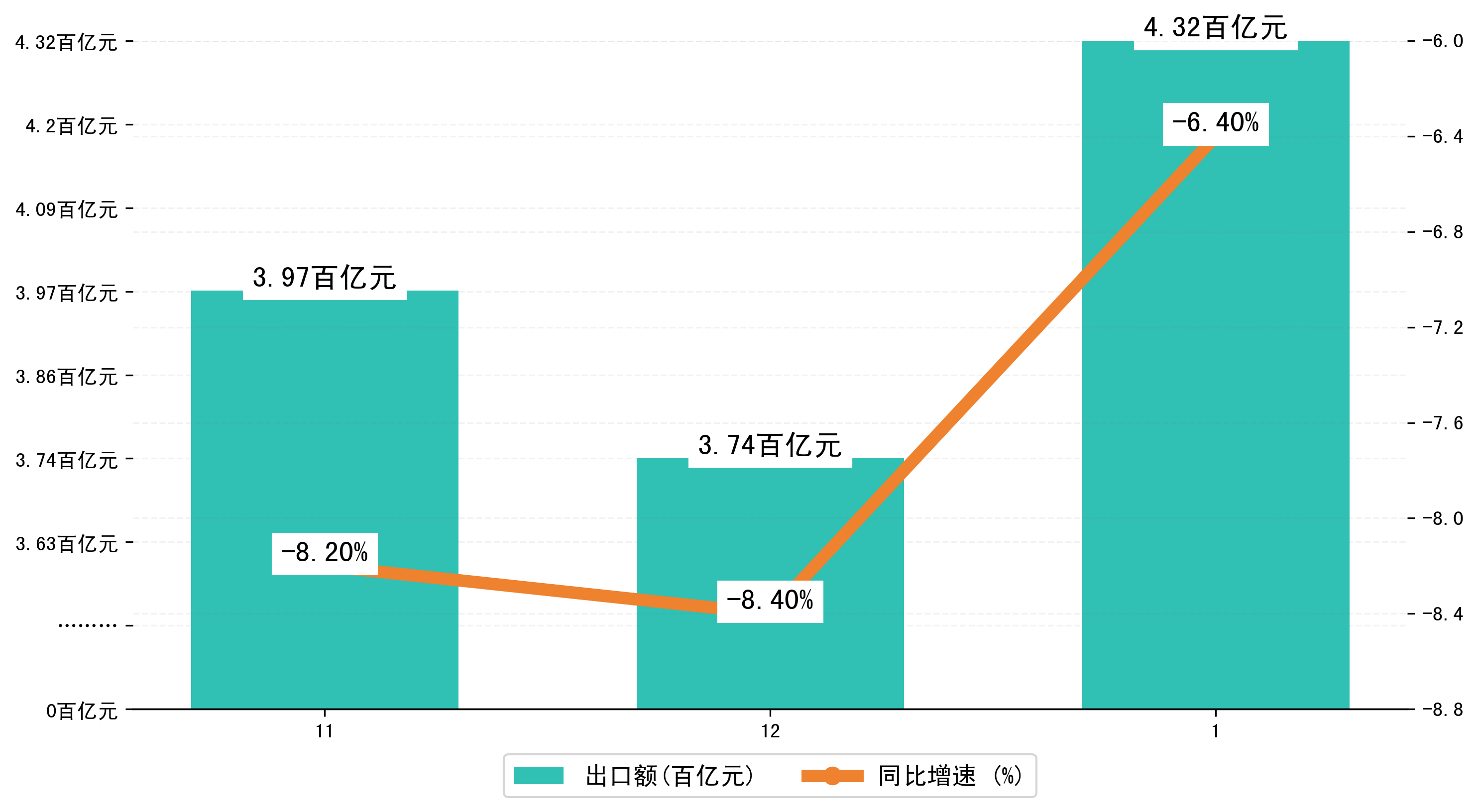 以人民币计,2024年1-1月成都市出口额为431,7075.5691万元,相比上年同期减少了52,7719.5045万元,同比减少了-6.40%。