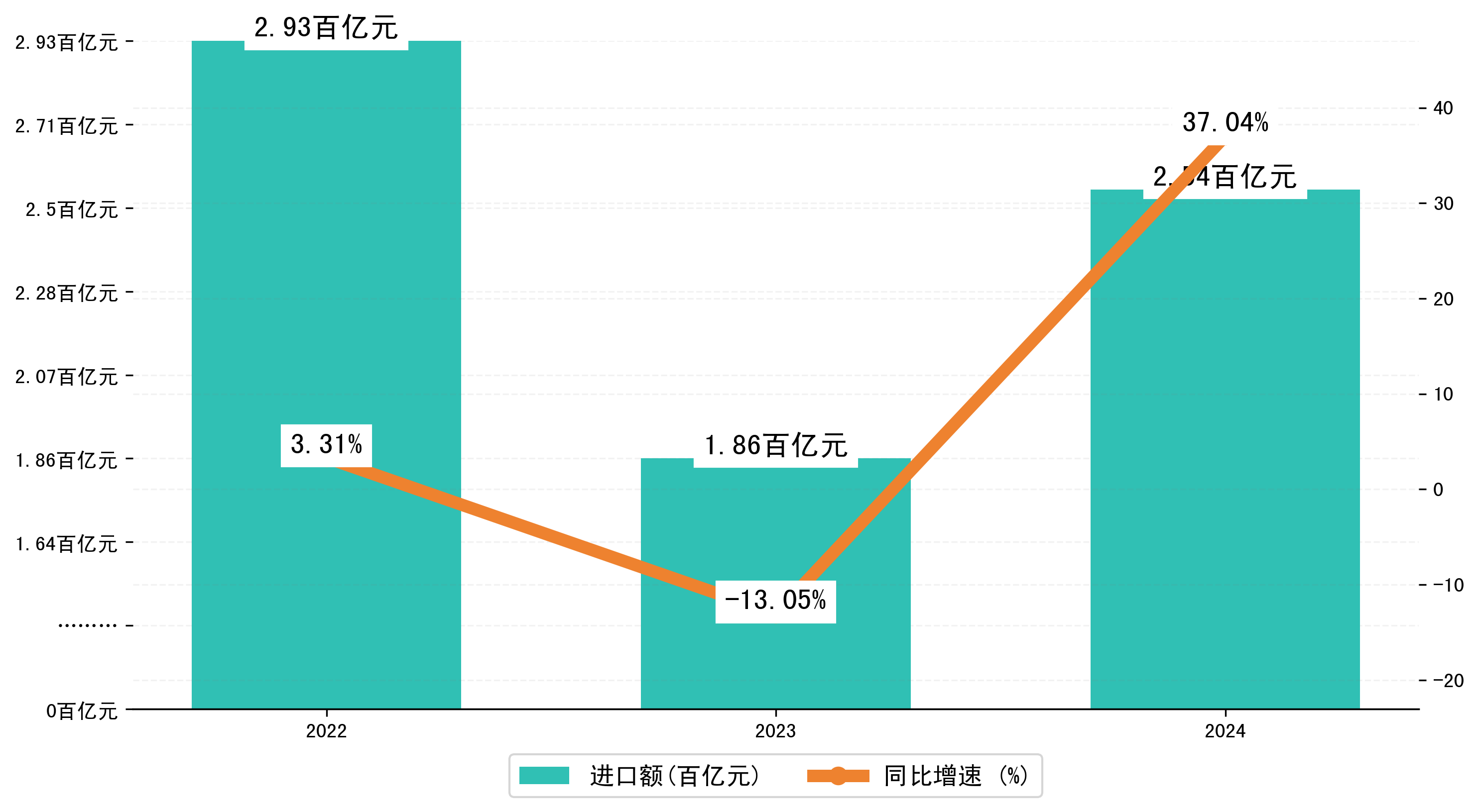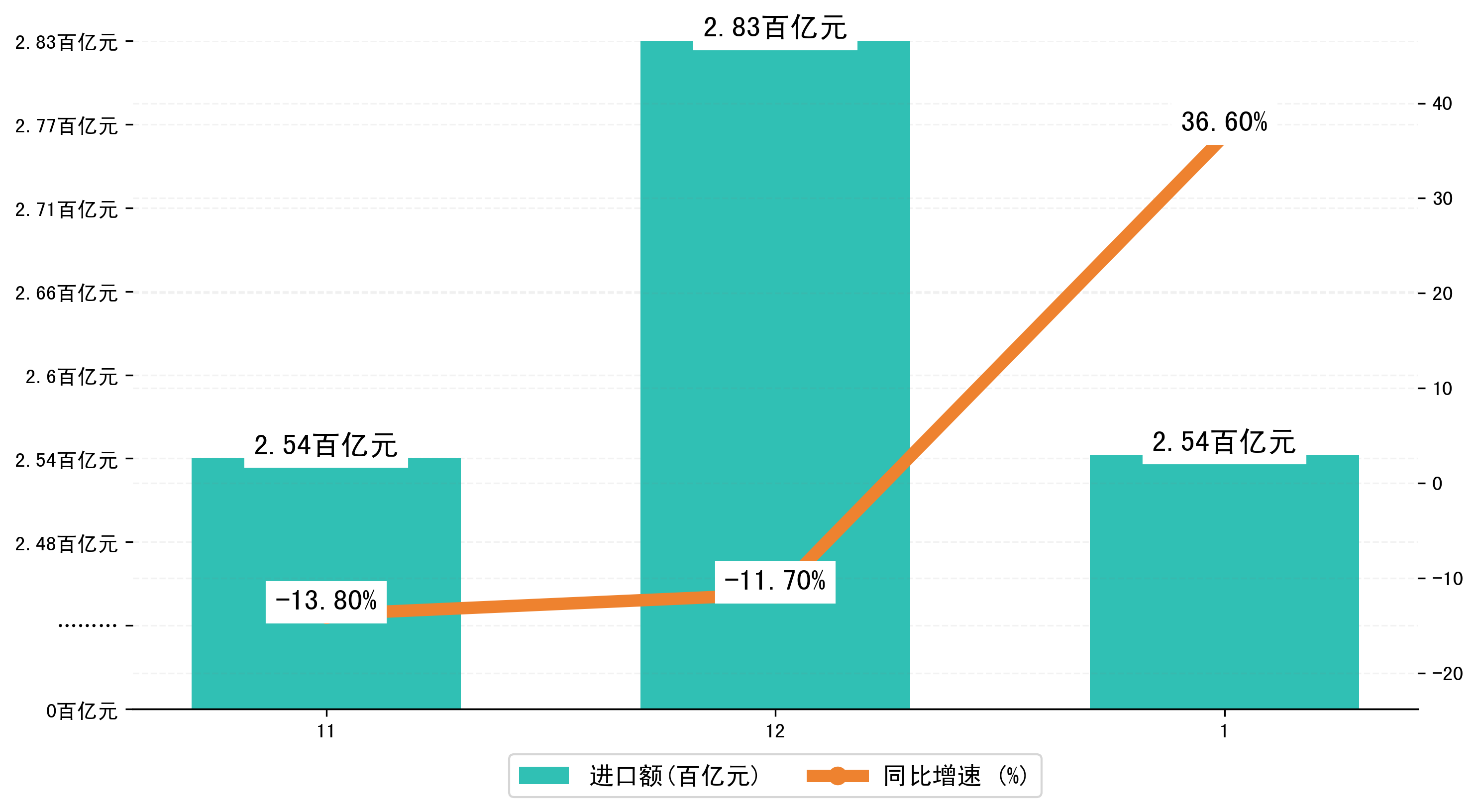 以美元计,2024年1-1月成都市进口额为35,8569.7375万美元,相比上年同期增加了9,2435.3204万美元,同比增加34.30%。