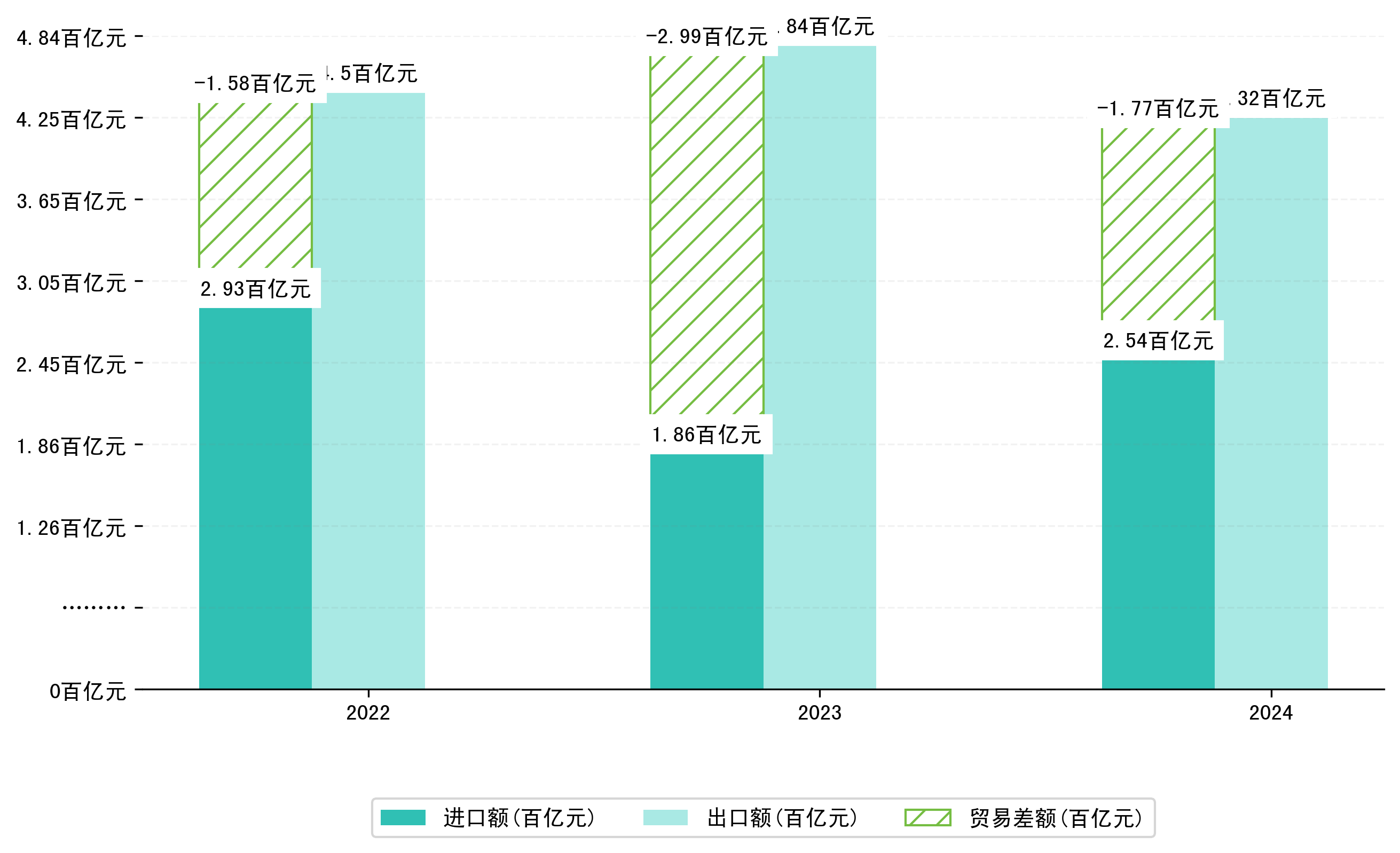 以人民币计,2024年1月成都市贸易差额为177,3414,3204万元(贸易顺差),相比上月增加了85,8372,2753万元,即12,2014,5712万美元;相比上年同期减少了121,5257,9230万元,同比减少-40.66%。