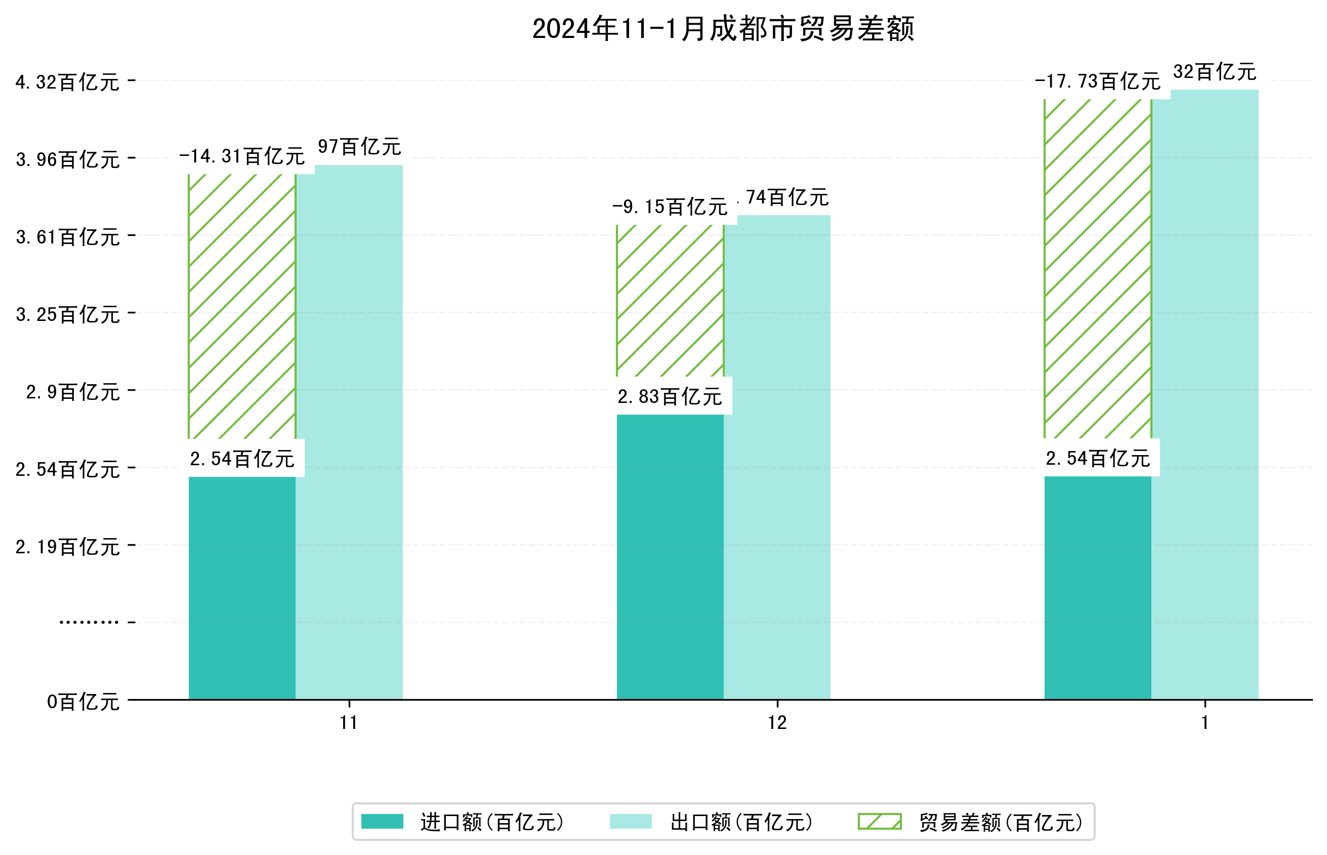 以人民币计,2024年1月成都市进口额为254,3661.2487万元,相比上月减少了28,2646.9437万元;相比上年同期增加了68,7538.4185万元,同比增加了36.60%。