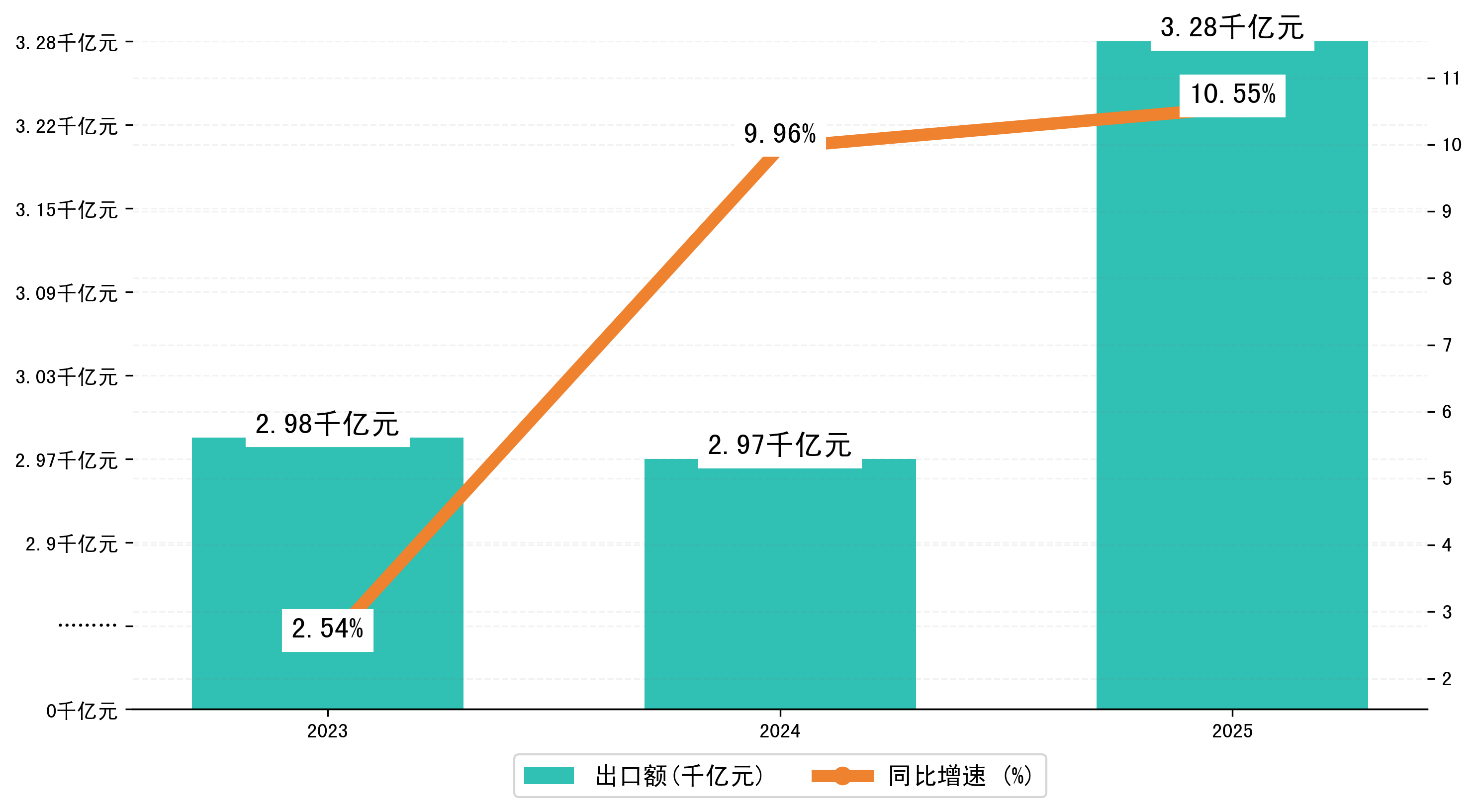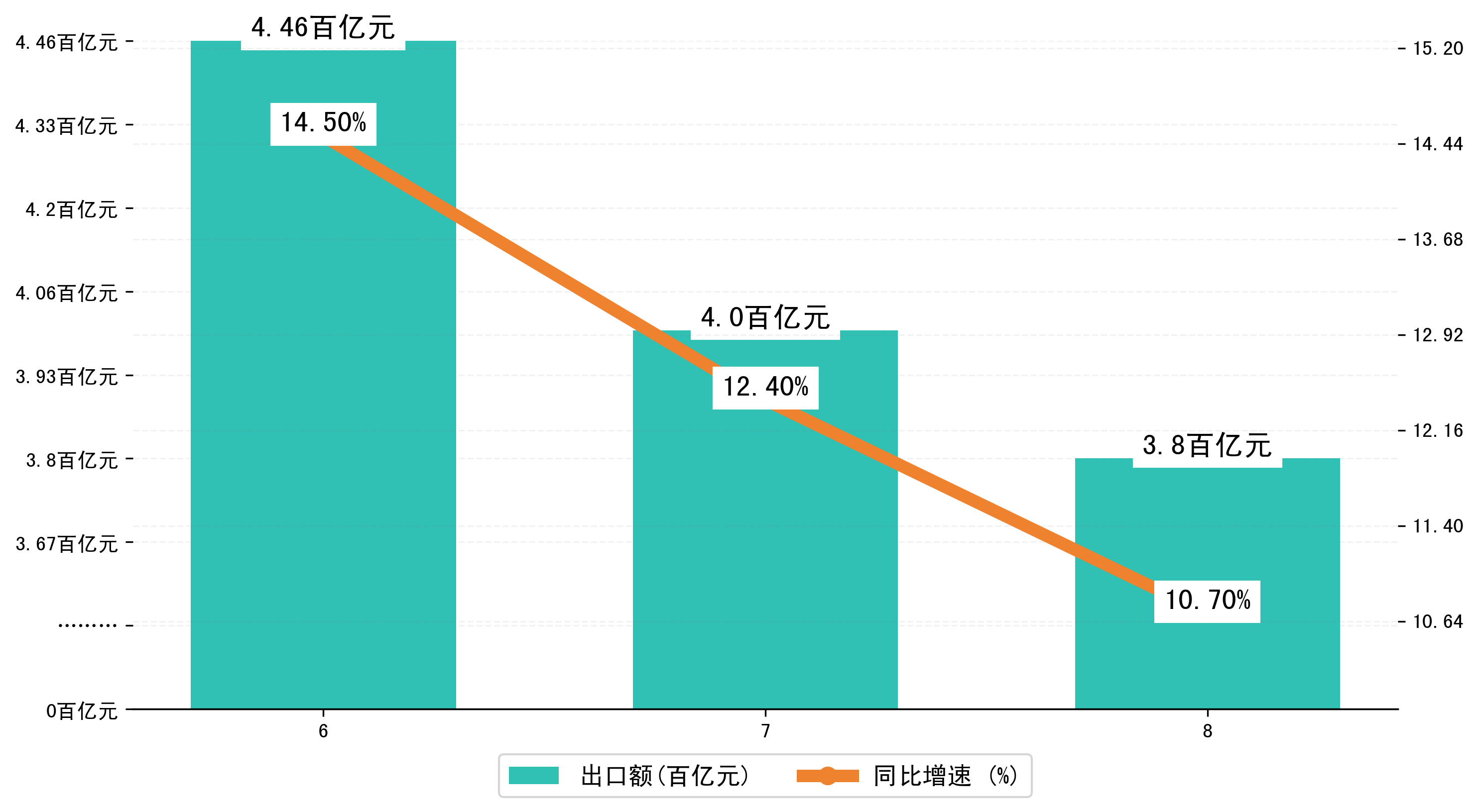 以人民币计,2025年1-8月成都市出口额为3280,0253.1053万元,相比上年同期增加了312,9146.166万元,同比增加了10.70%。