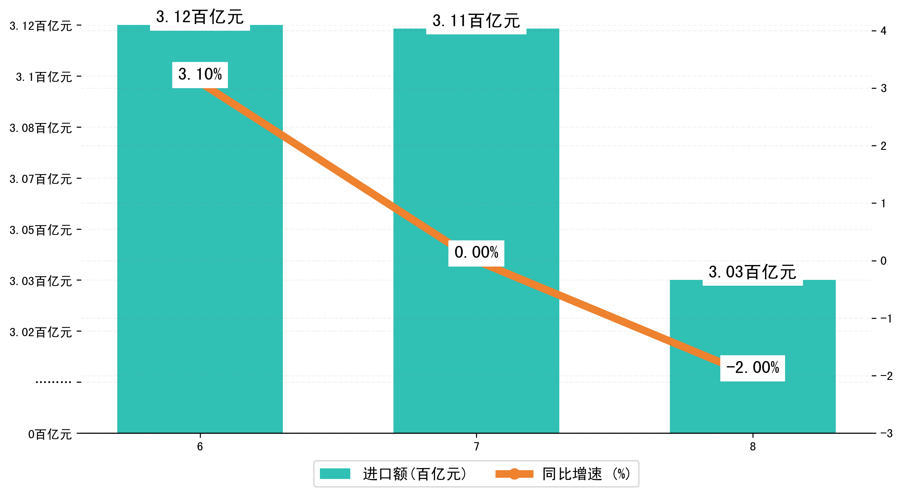 以人民币计,2025年8月成都市进口额为303,4380.4119万元,相比上月减少了8,0576.0196万元;相比上年同期减少了51,4216.9459万元,同比减少了-2.00%。