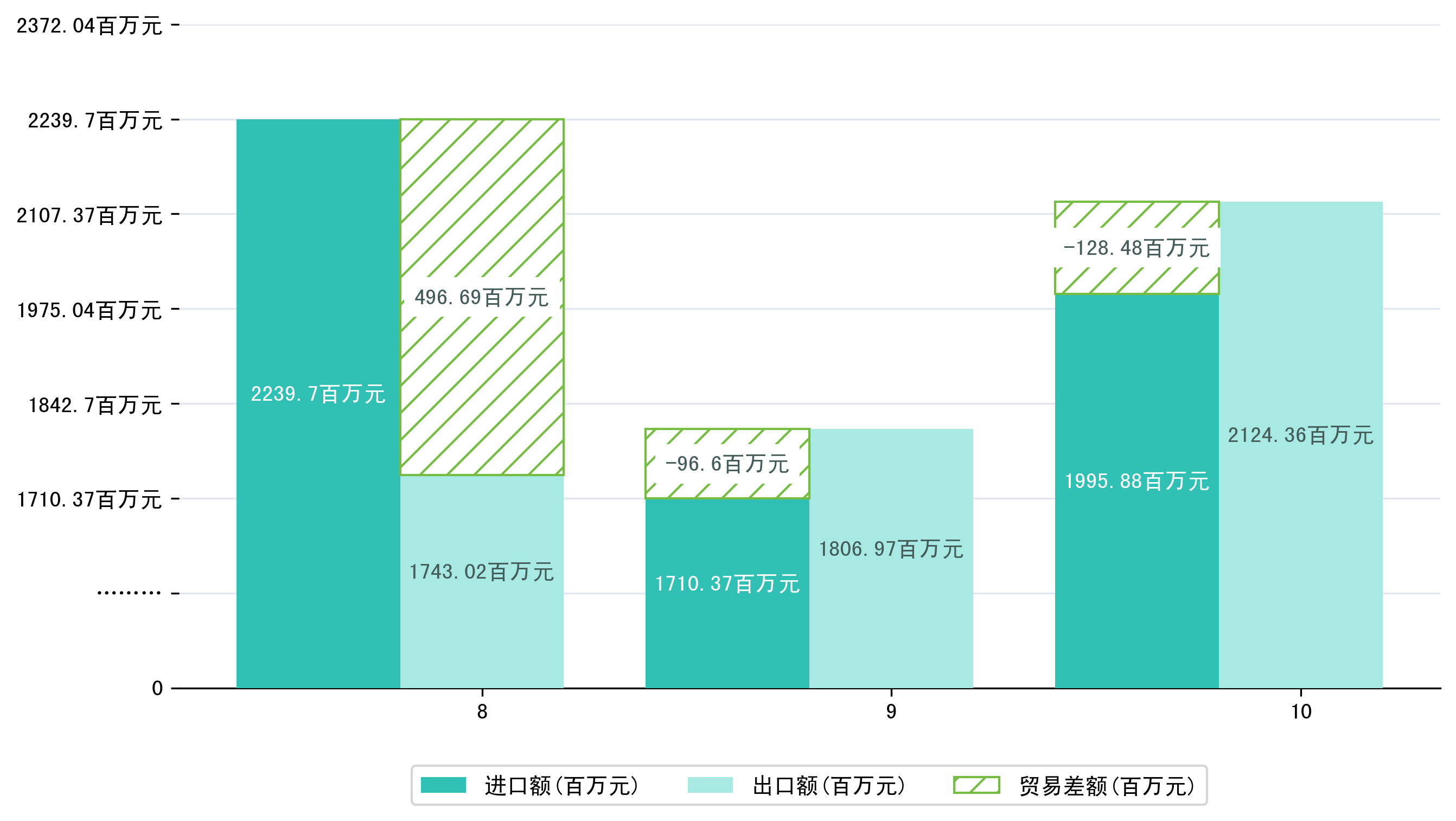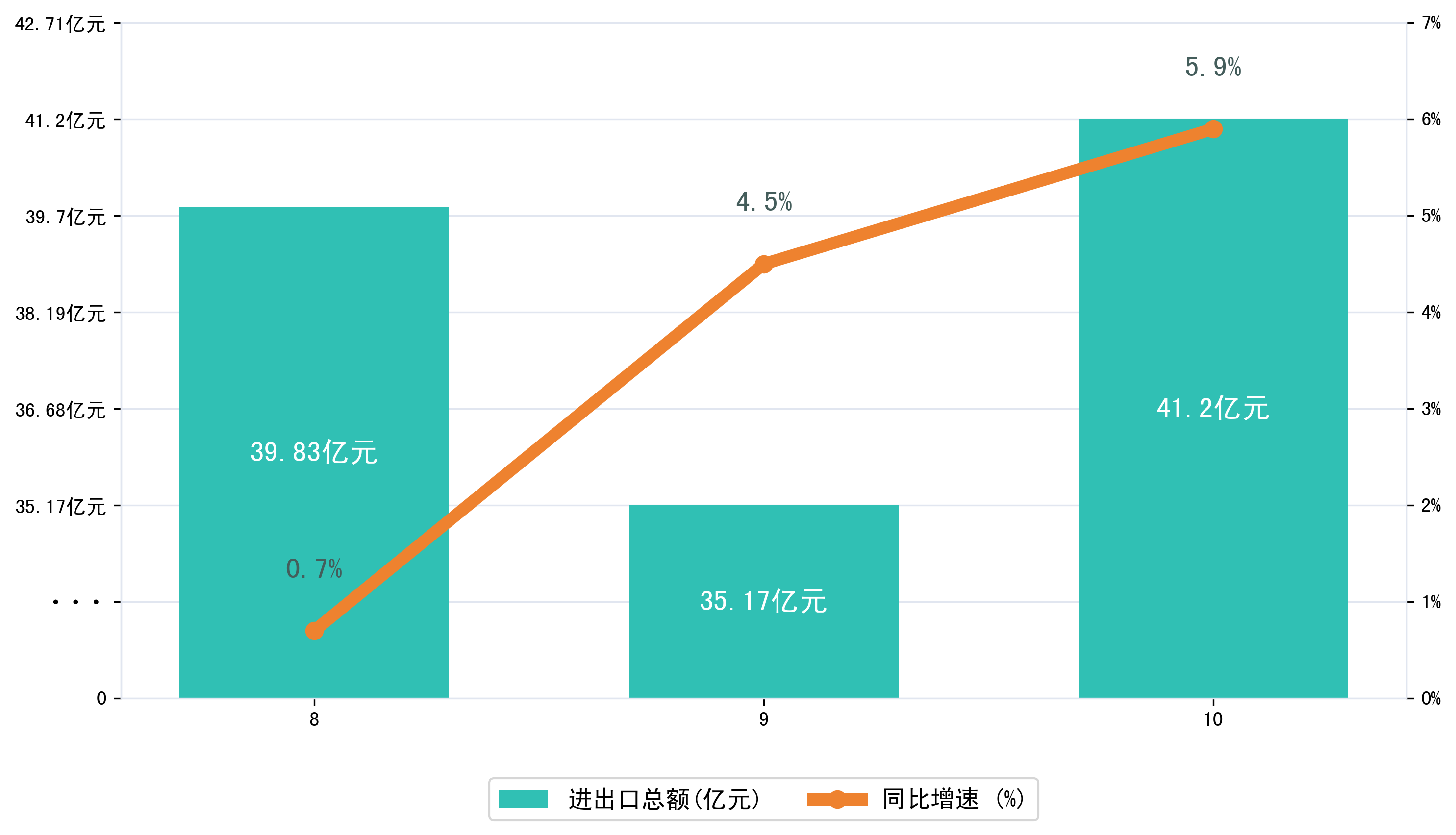 以人民币计,2025年10月郴州市进出口总额为41,2024.1896万元,相比上月增加了6,0290.8444万元;相比上年同期增加了6,3708.0869万元,同比增加了5.90%。
