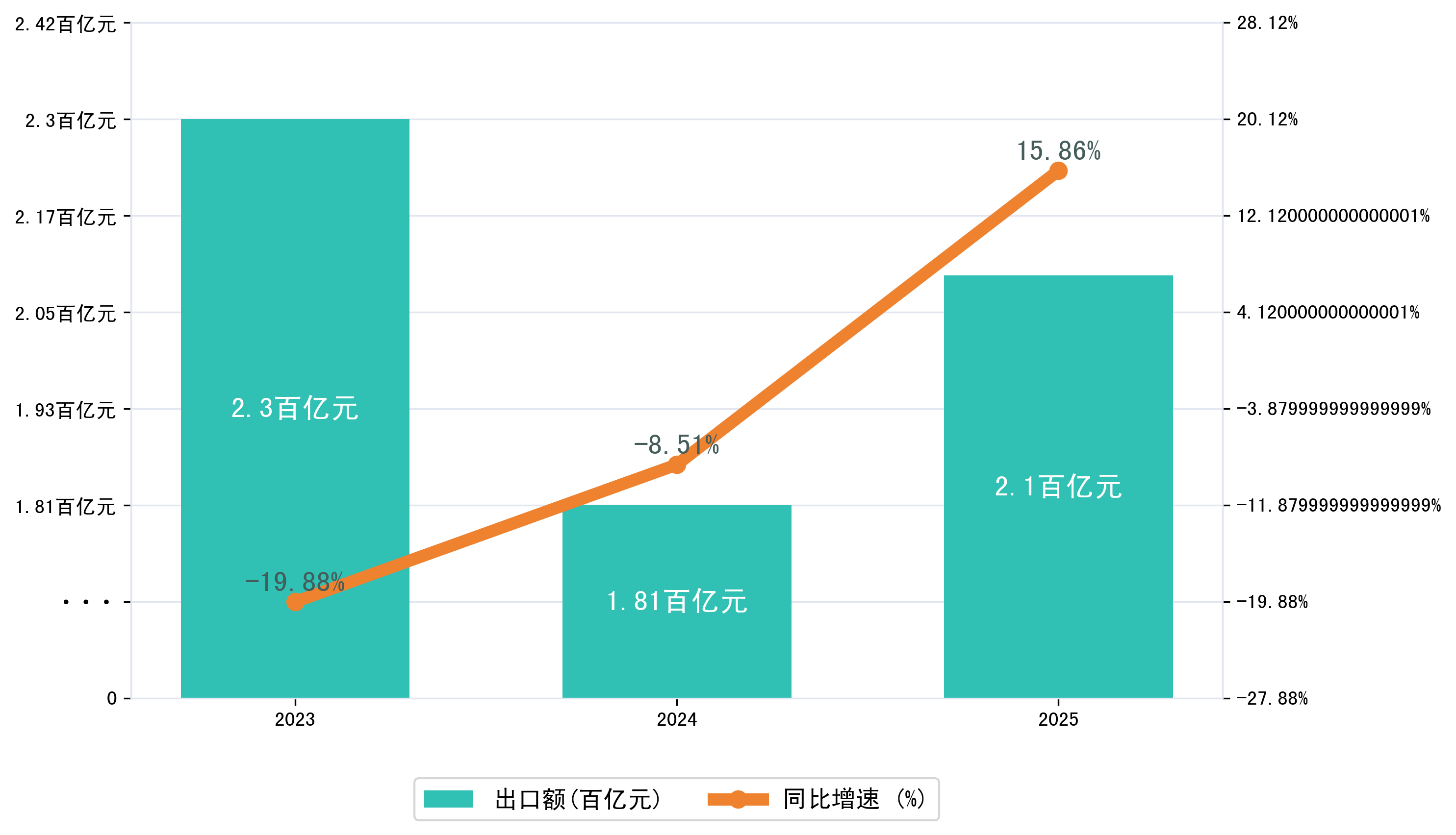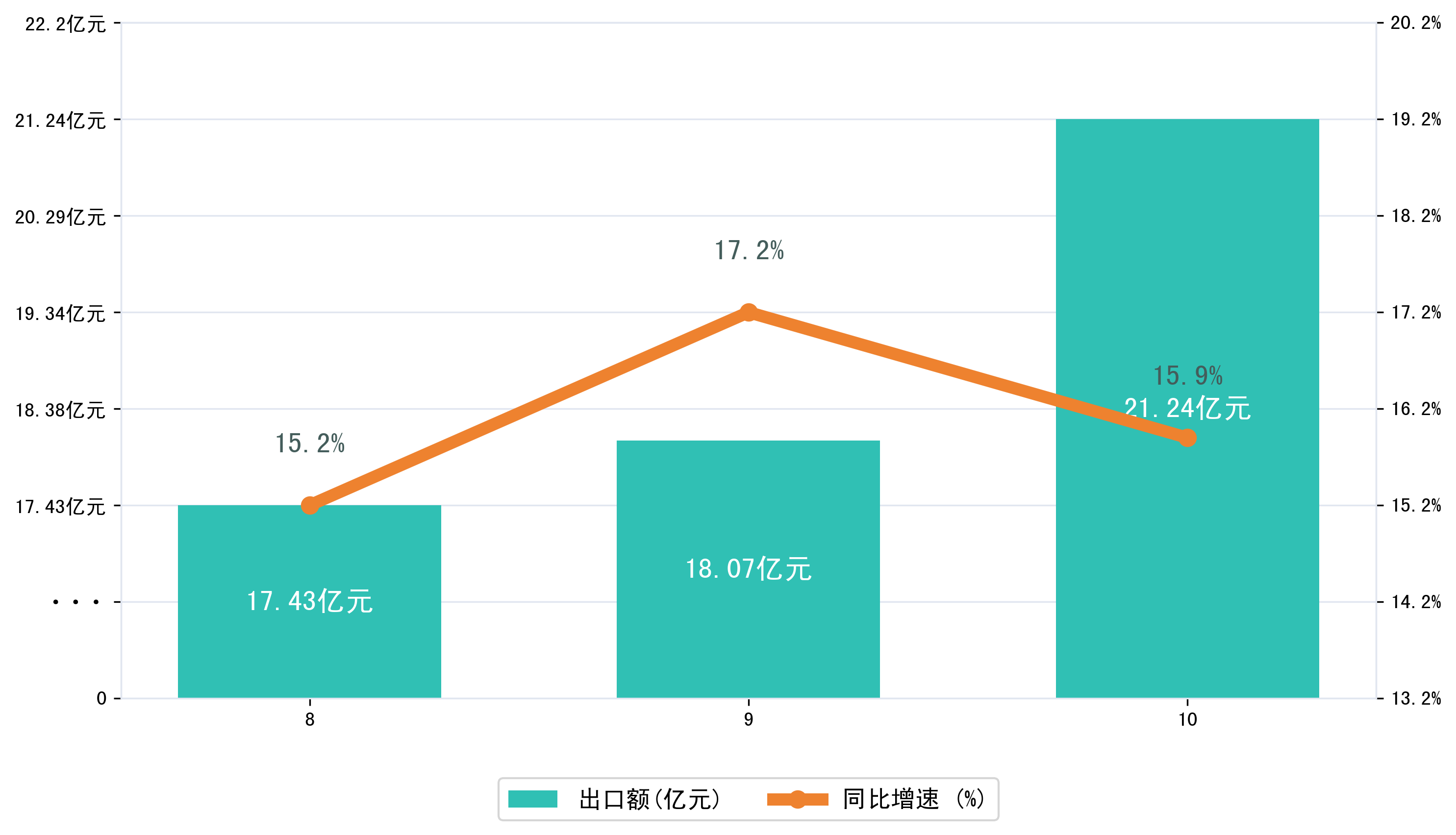 以人民币计,2025年1-10月郴州市出口额为210,0219.0625万元,相比上年同期增加了28,7514.4866万元,同比增加了15.90%。