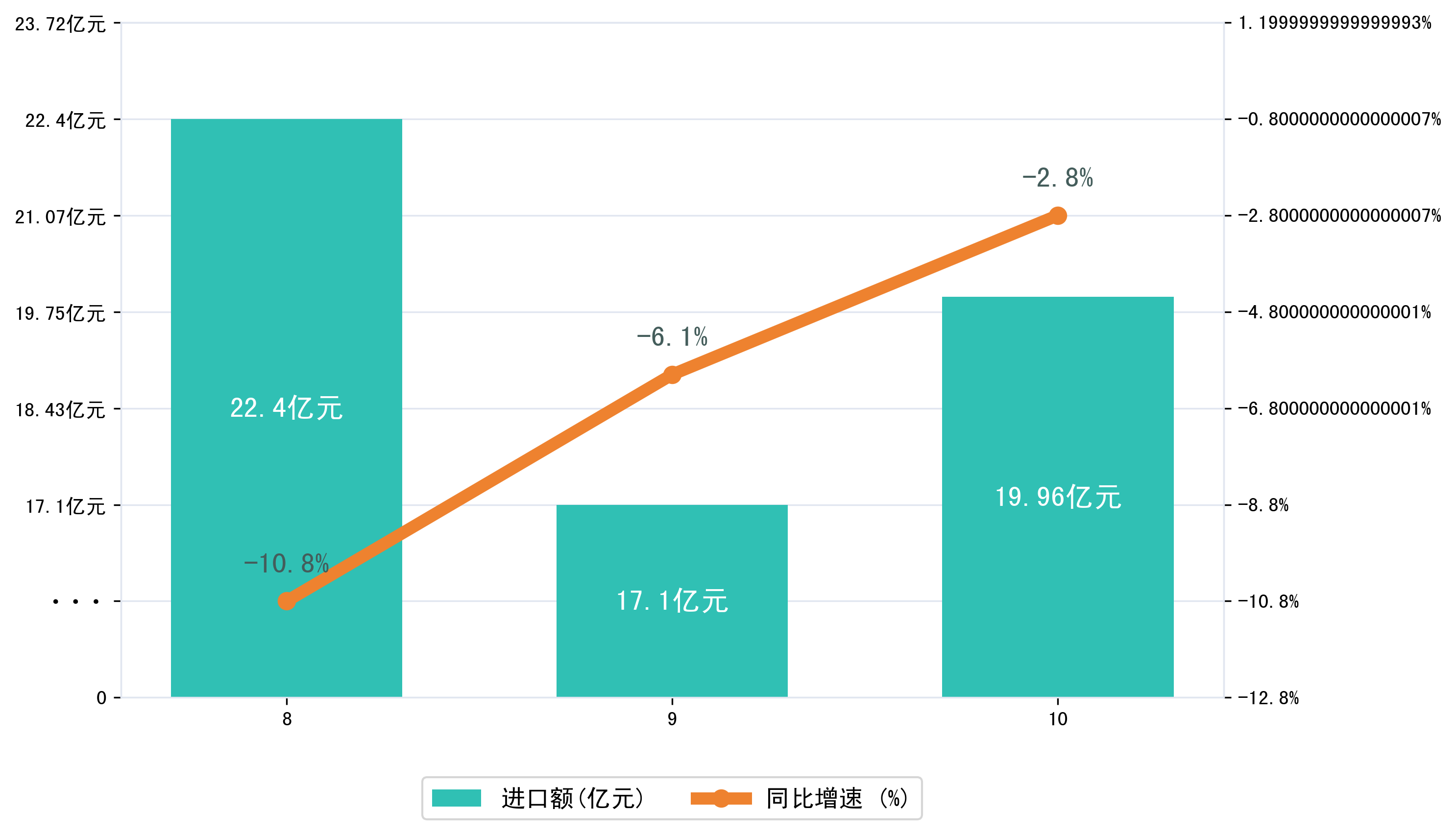 以美元计,2025年1-10月郴州市进口额为28,2038.0033万美元,相比上年同期减少了1,0137.2945万美元,同比减少-3.70%。