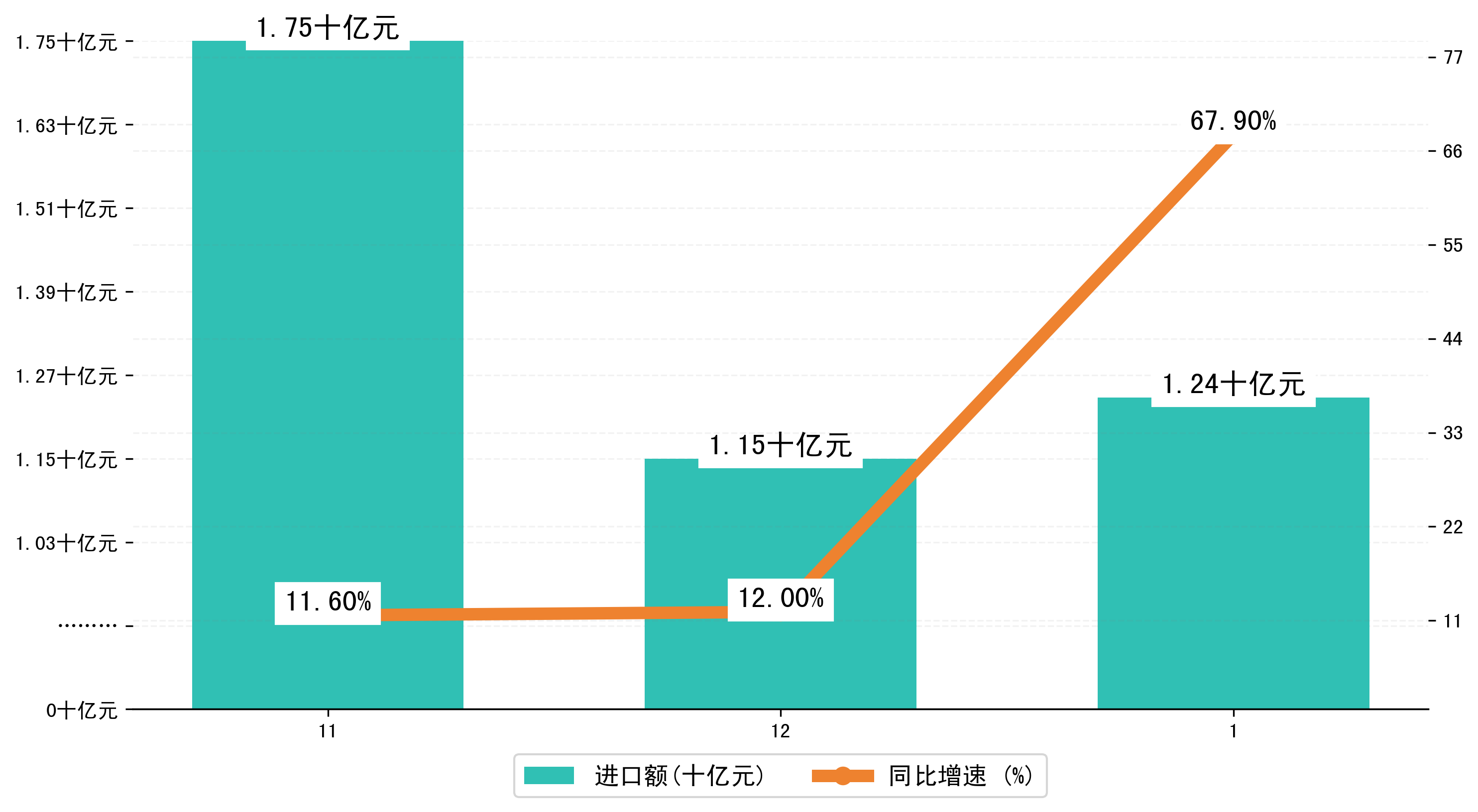 以人民币计,2025年1-1月池州市进口额为12,3529.424万元,相比上年同期增加了5,0654.292万元,同比增加了67.90%。