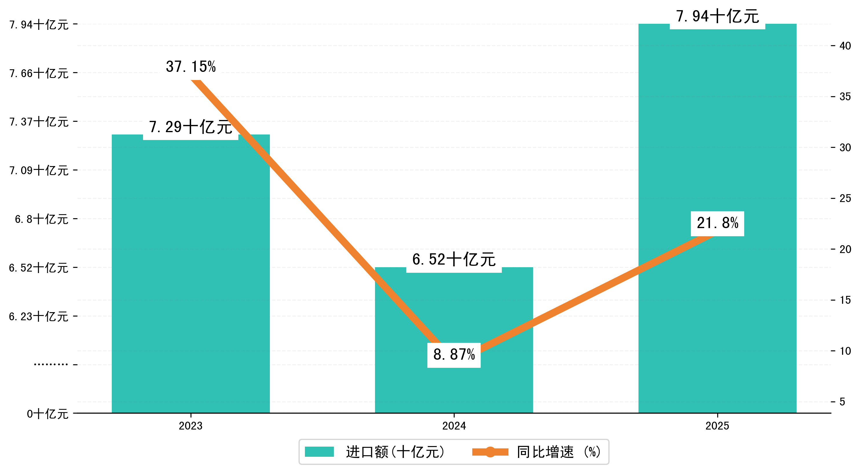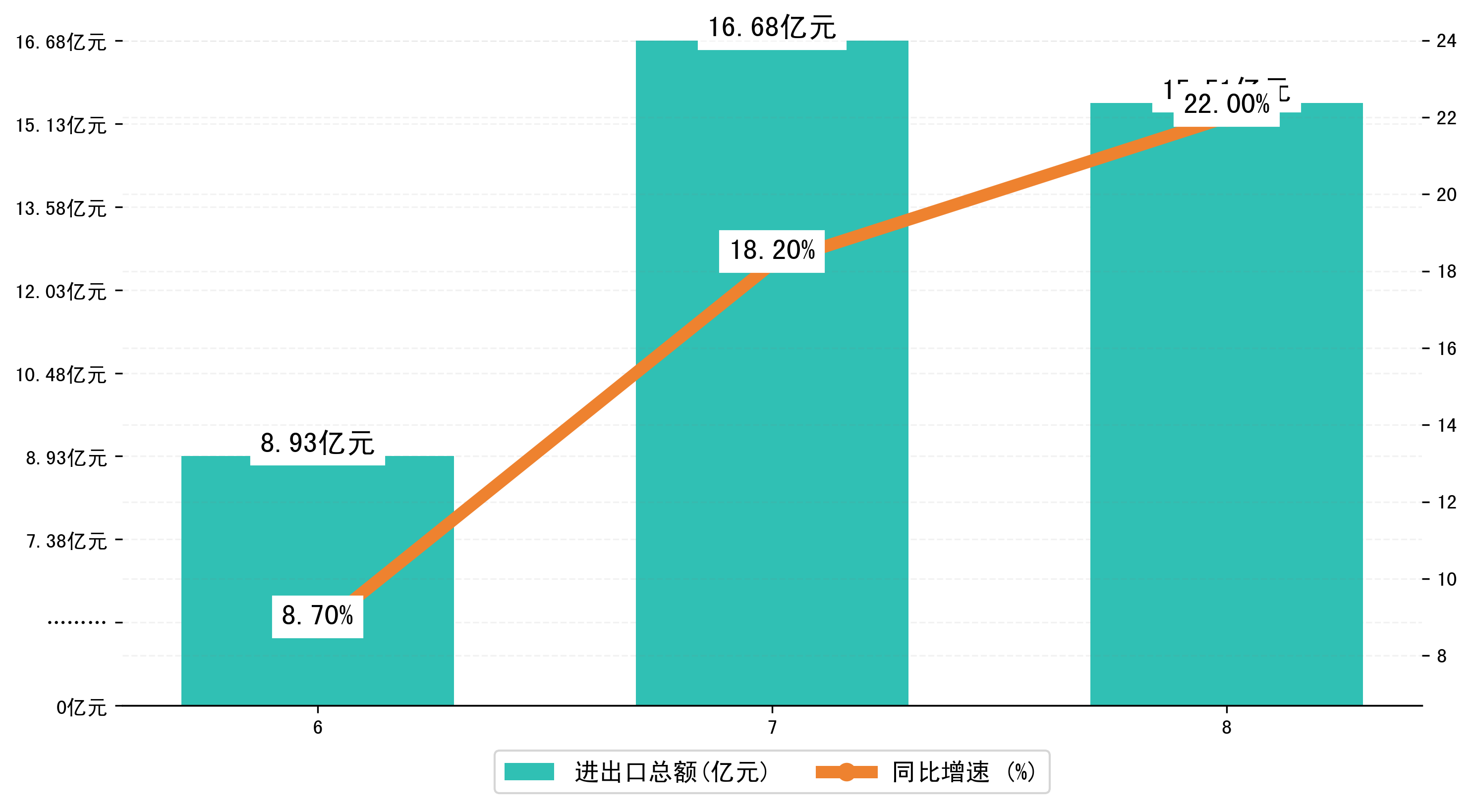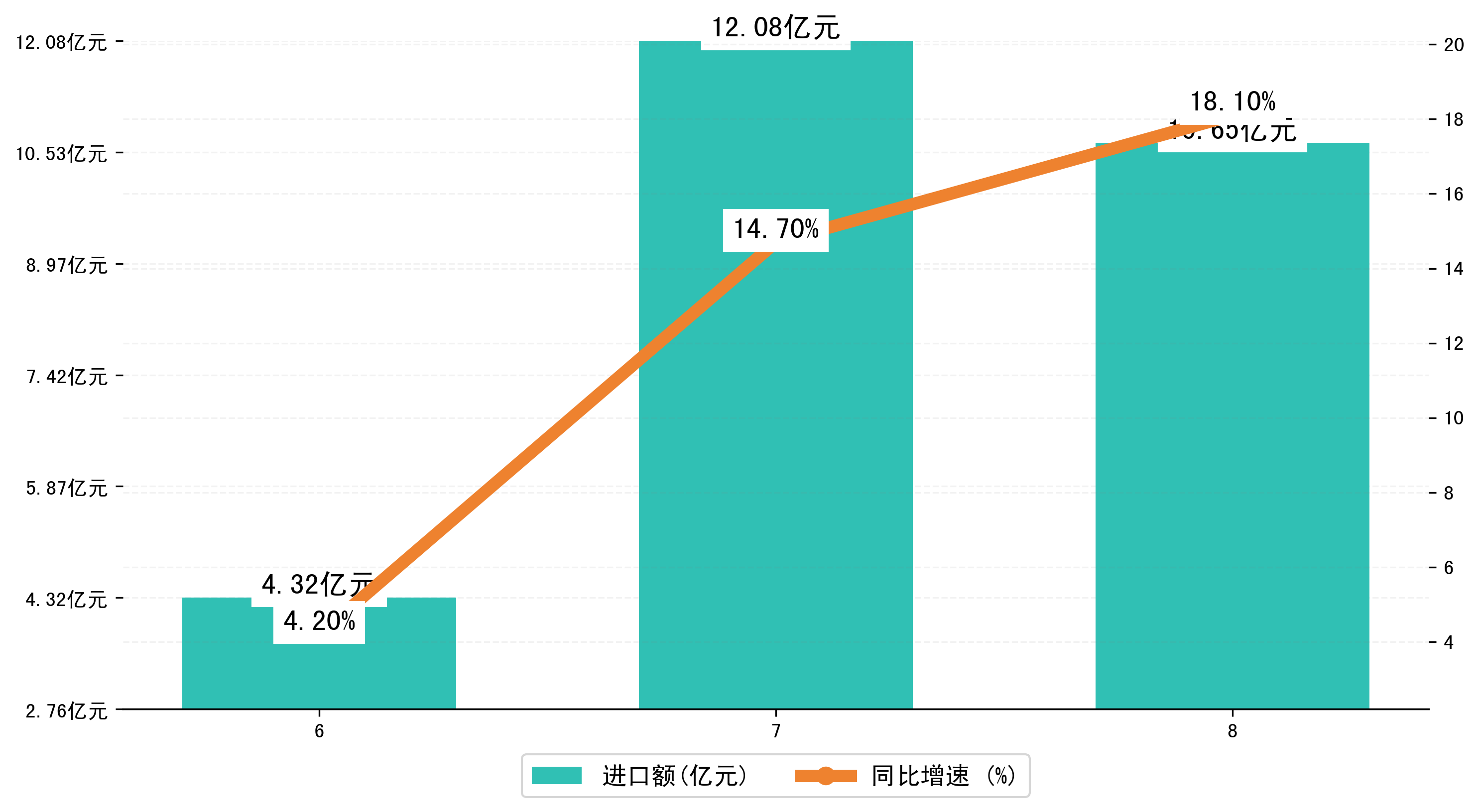 以人民币计,2025年1-8月池州市进口额为79,3956.8804万元,相比上年同期增加了14,2110.1527万元,同比增加了18.10%。