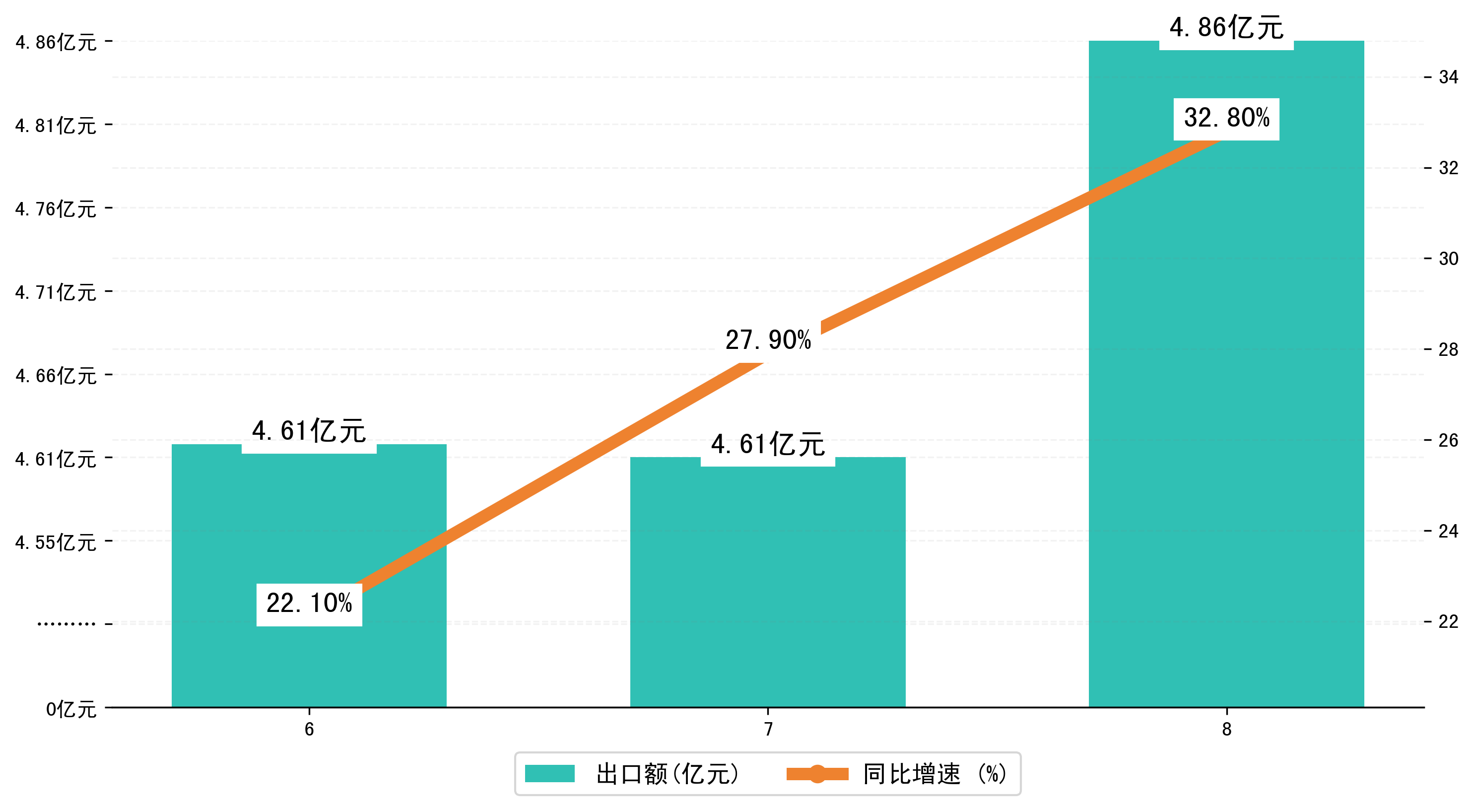 以美元计,2025年1-8月池州市出口额为4,4683.7461万美元,相比上年同期增加了1,0804.5618万美元,同比增加31.50%。