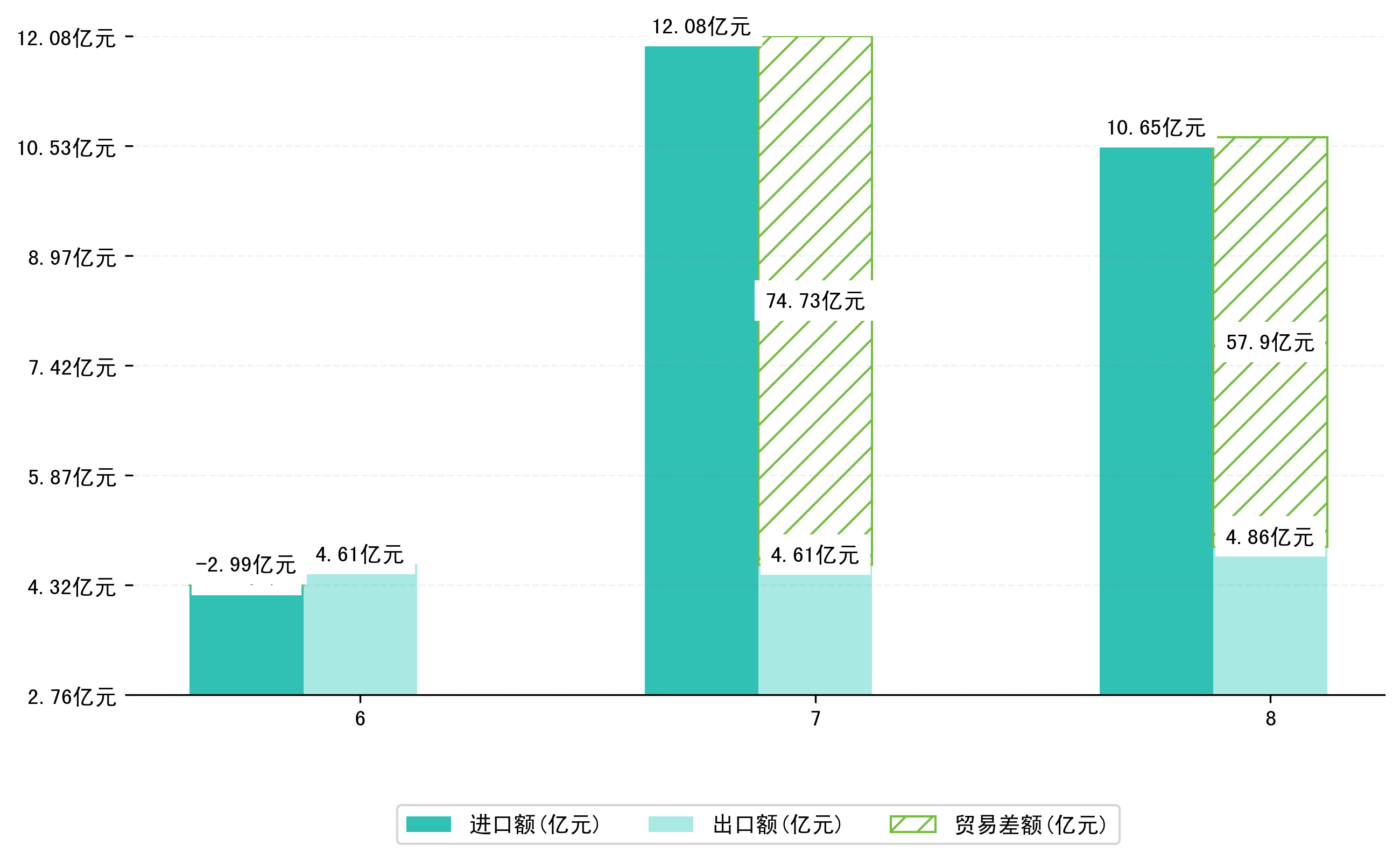以人民币计,2025年1-8月池州市贸易差额为47,3065,9789万元(贸易逆差),相比上年同期减少了6,2002,0328万元,同比减少15.08%。