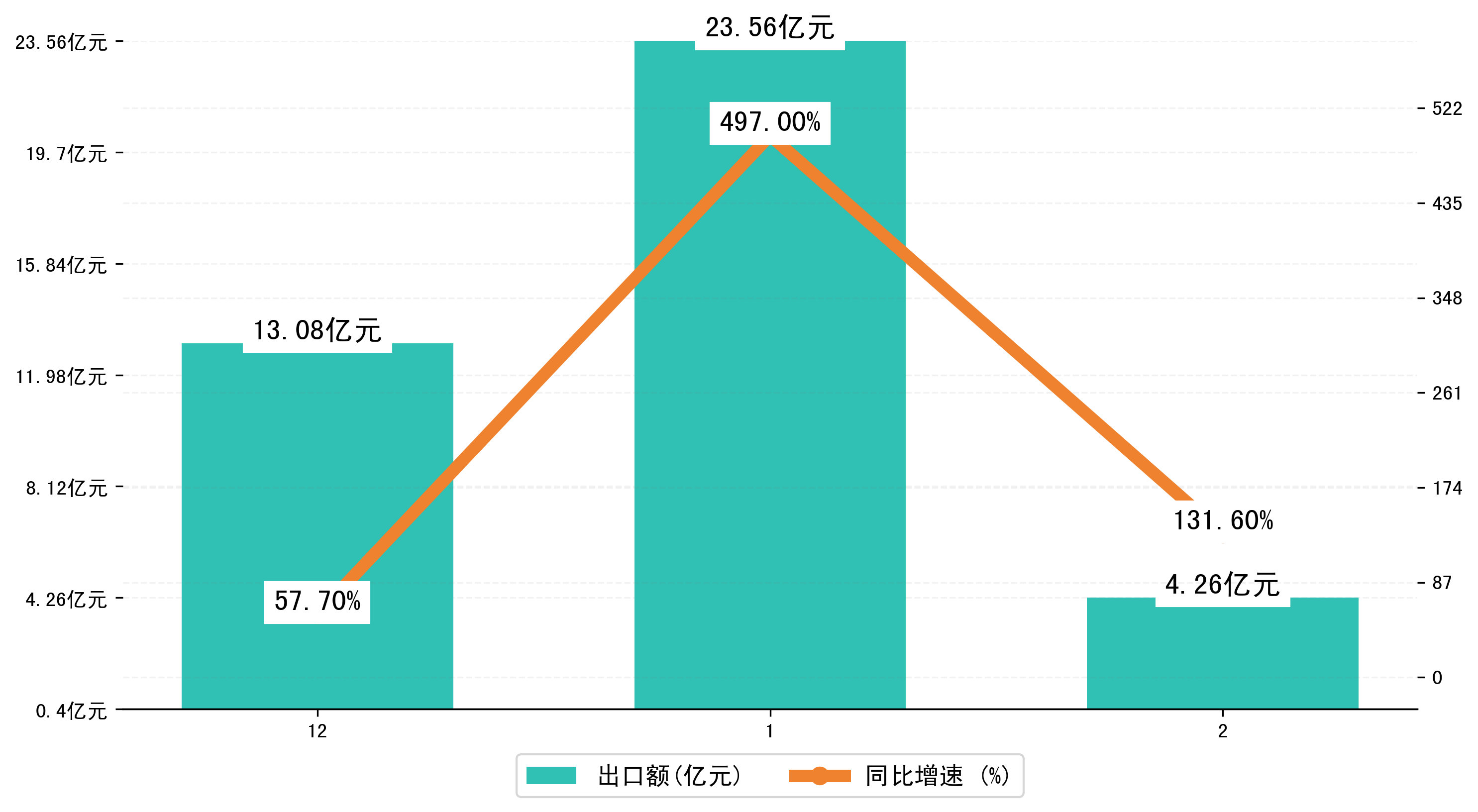 以美元计,2024年1-2月防城港市出口额为3,9008.1671万美元,相比上年同期增加了2,1423.6949万美元,同比增加121.90%。