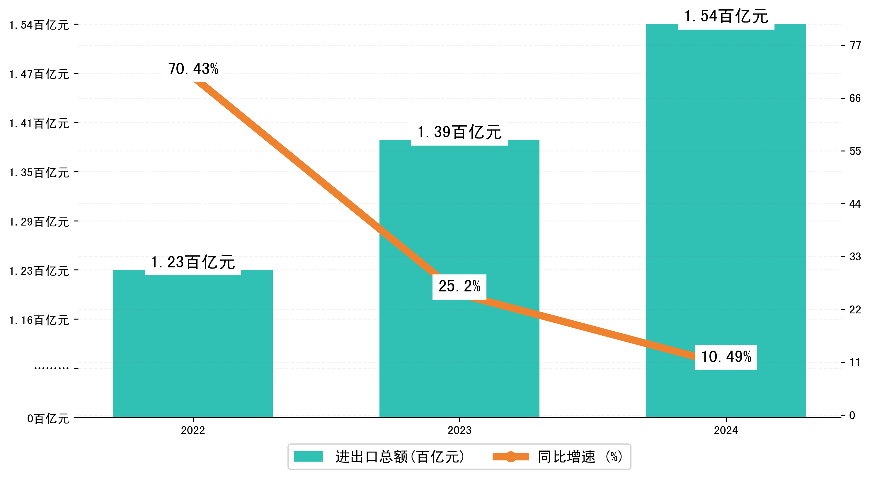 以人民币计,2024年1-2月防城港市进出口总额为153,5735.4214万元,相比上年同期增加了14,5750.5517万元,同比增加了8.10%。