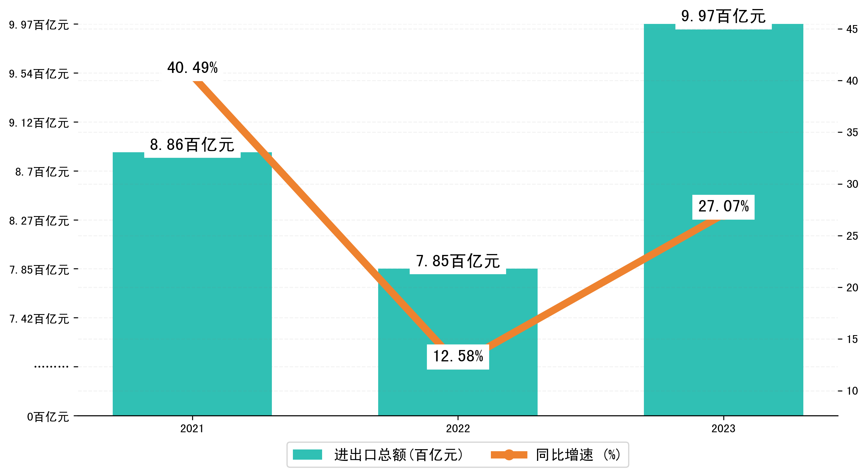 以人民币计,2023年1-12月防城港市进出口总额为996,9238.9348万元,相比上年同期增加了212,3551.7582万元,同比增加了27.90%。