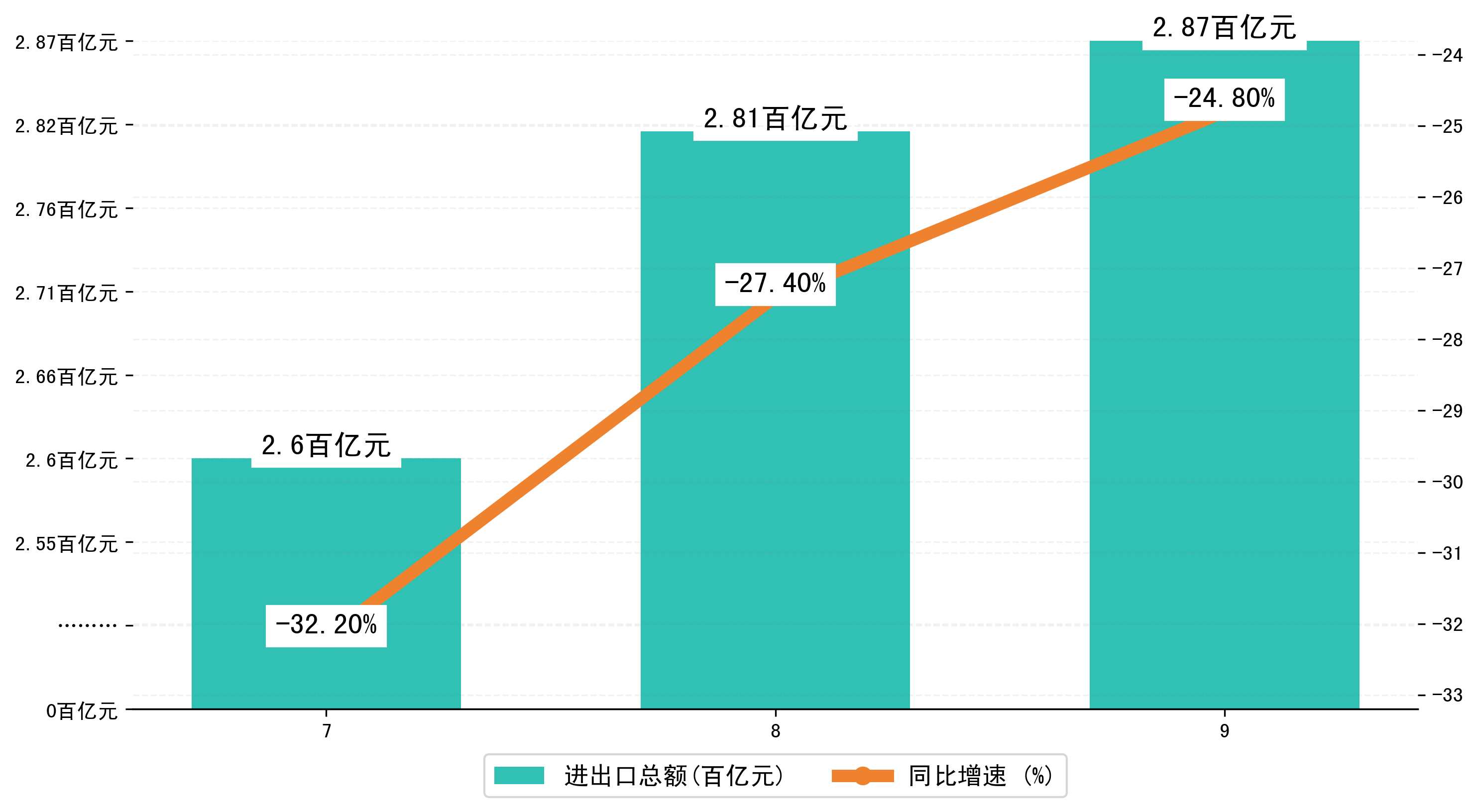 以人民币计,2025年9月福州市进出口总额为287,3684.4481万元,相比上月增加了5,9348.7718万元;相比上年同期减少了10,9603.2948万元,同比减少了-24.80%。