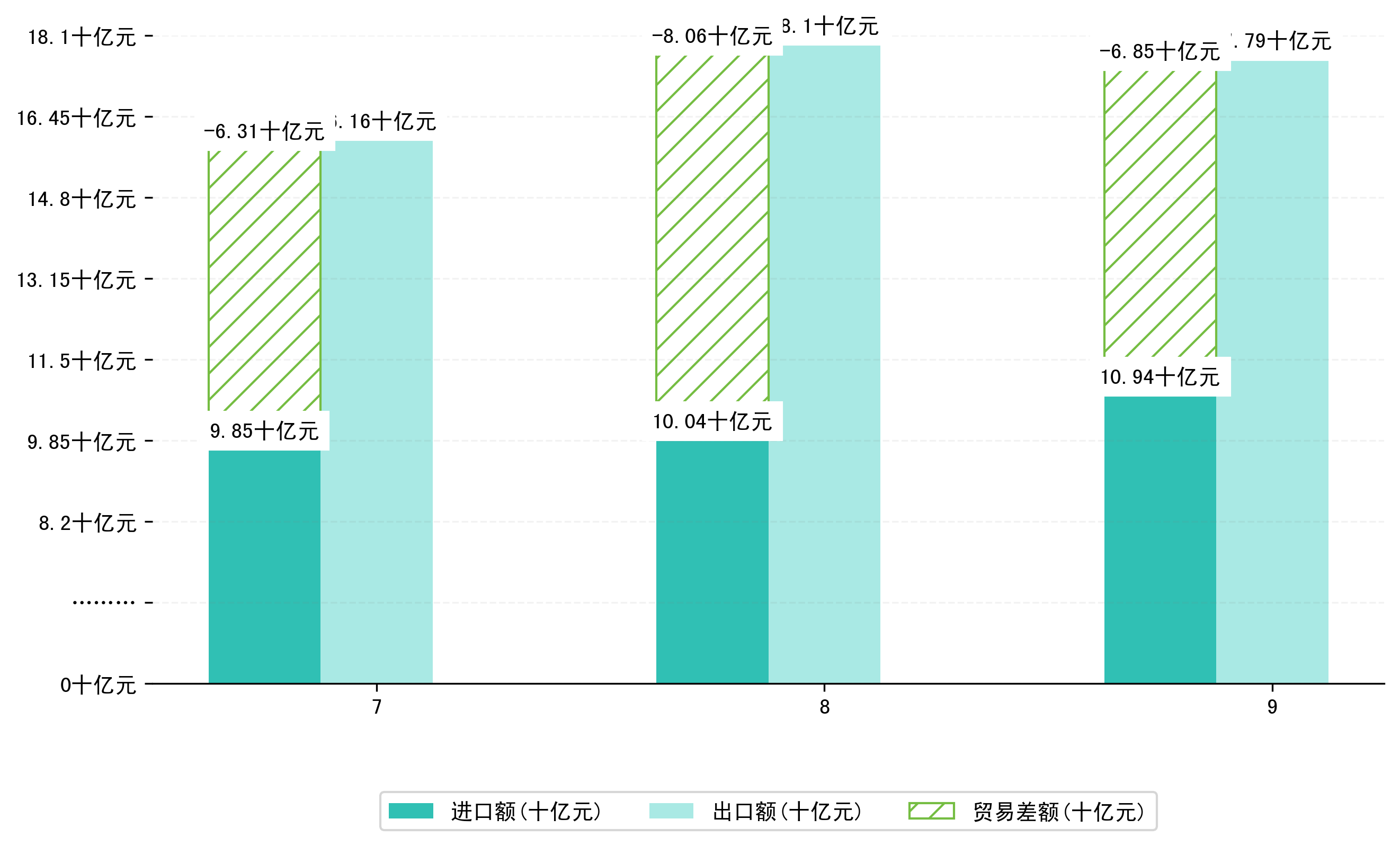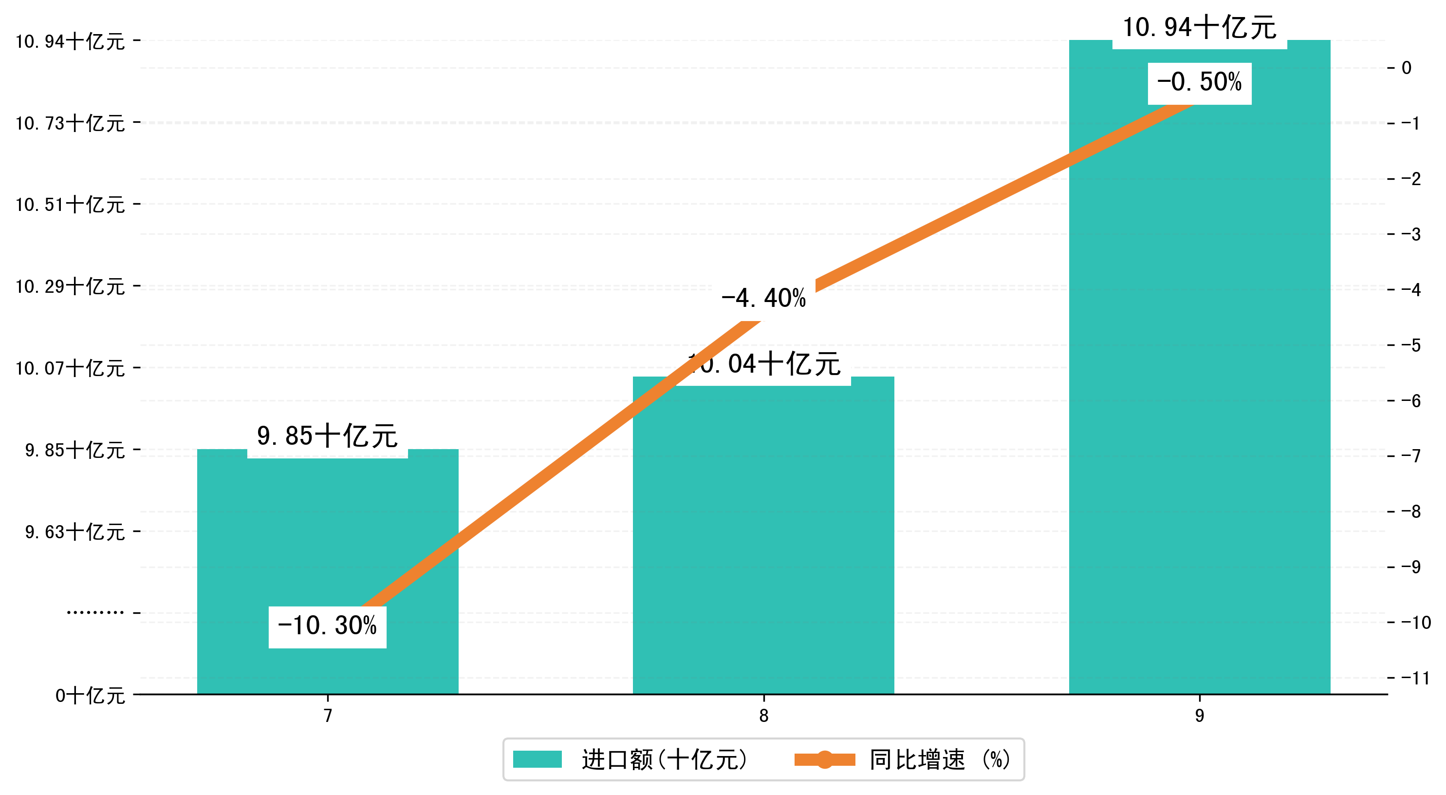以人民币计,2025年9月福州市进口额为109,4490.4734万元,相比上月增加了9,0351.9304万元;相比上年同期增加了23,6391.5306万元,同比减少了-0.50%。