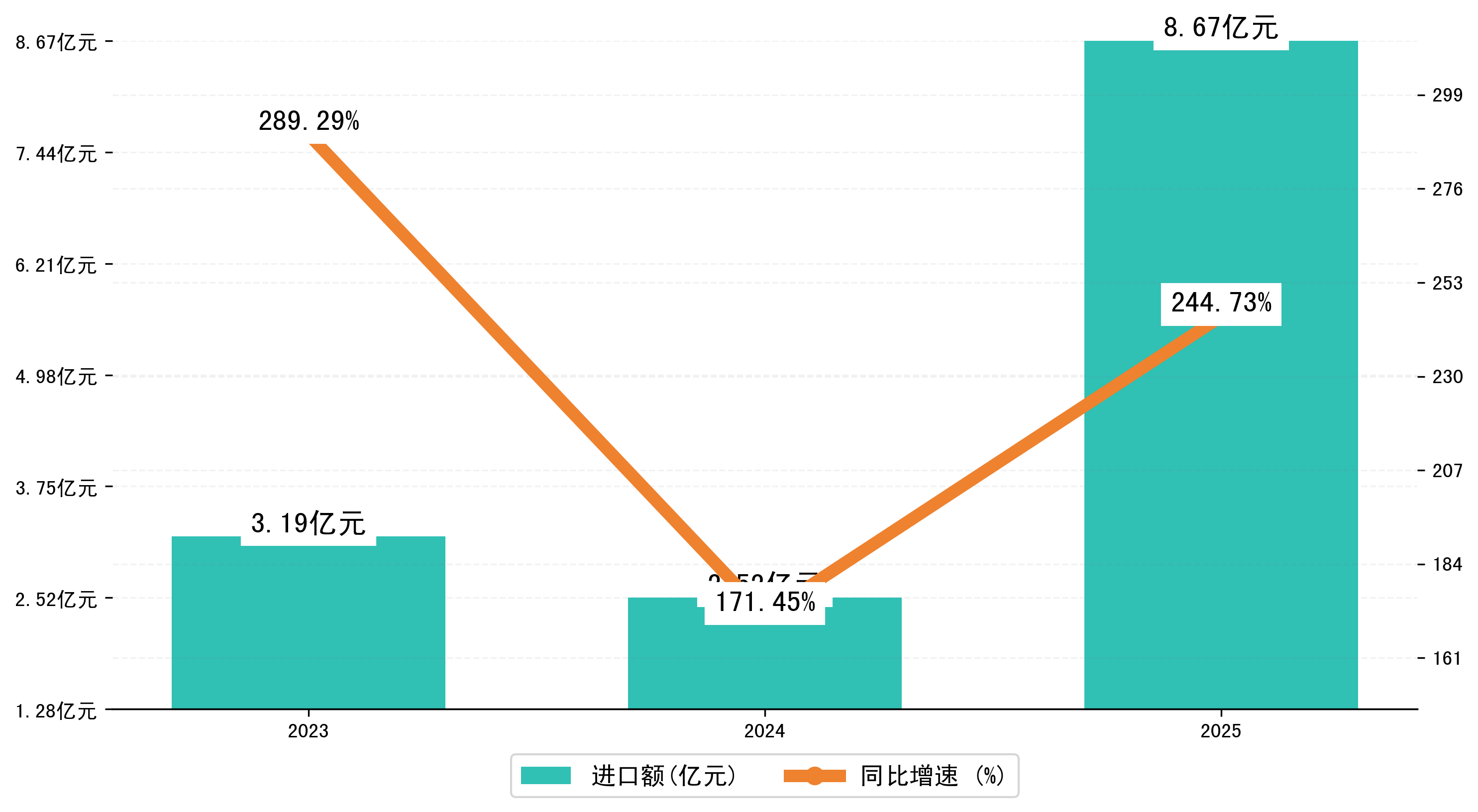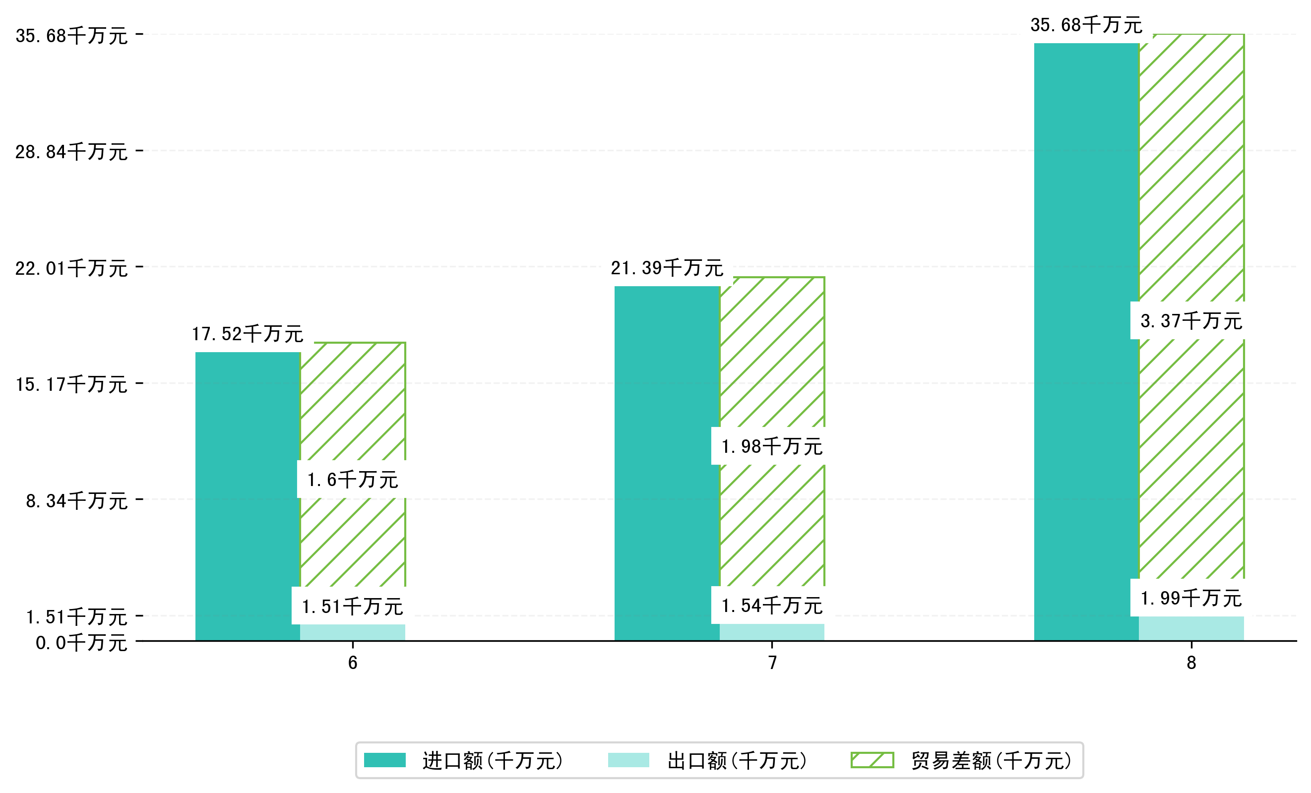 以人民币计,2025年1-8月广元市进口额为8,6703.302万元,相比上年同期增加了6,1552.5006万元,同比增加了244.70%。