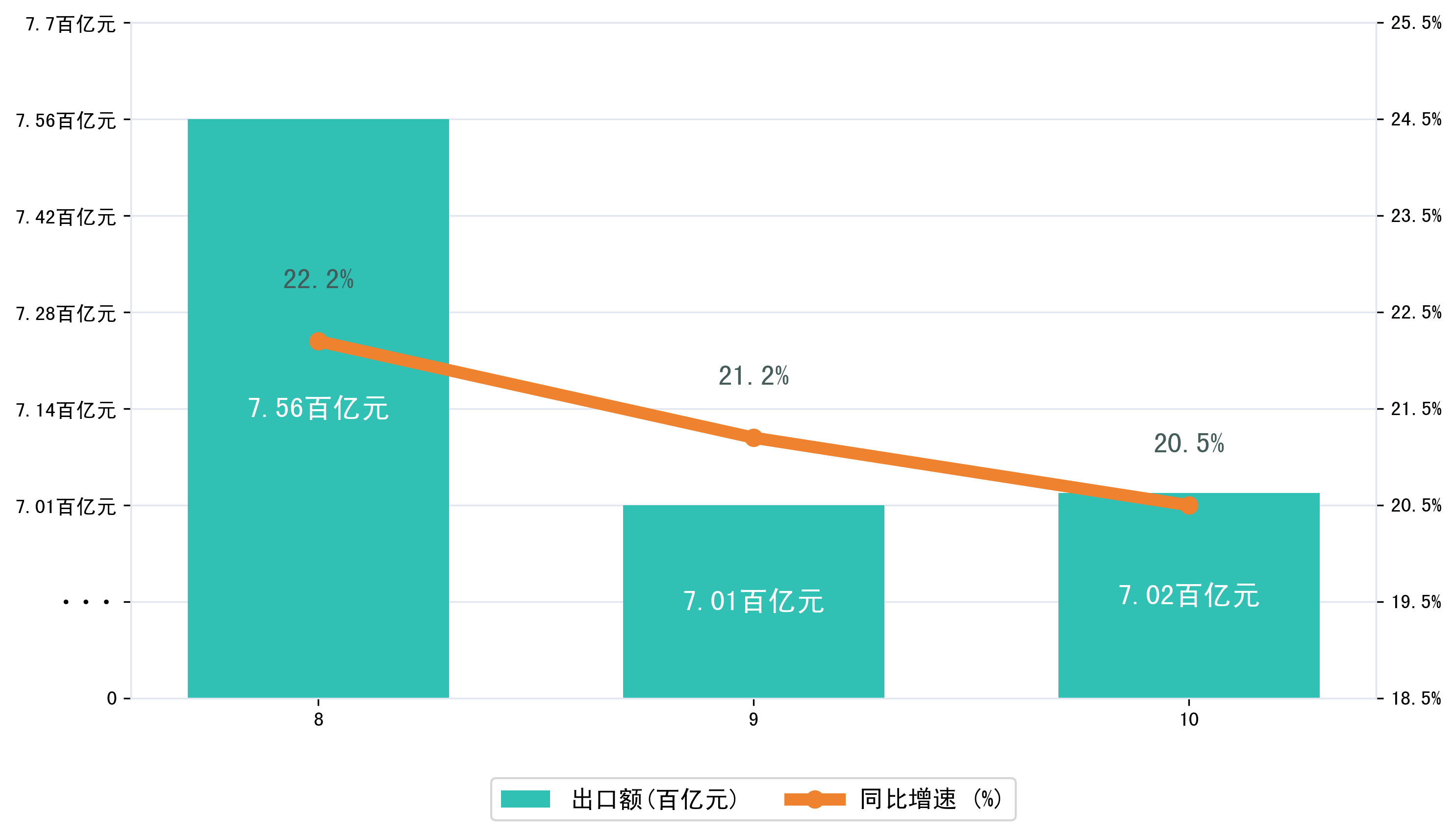 以人民币计,2025年10月广州市出口额为702,3817.5898万元,相比上月增加了1,7813.3832万元;相比上年同期增加了92,1947.4719万元,同比增加了20.50%。