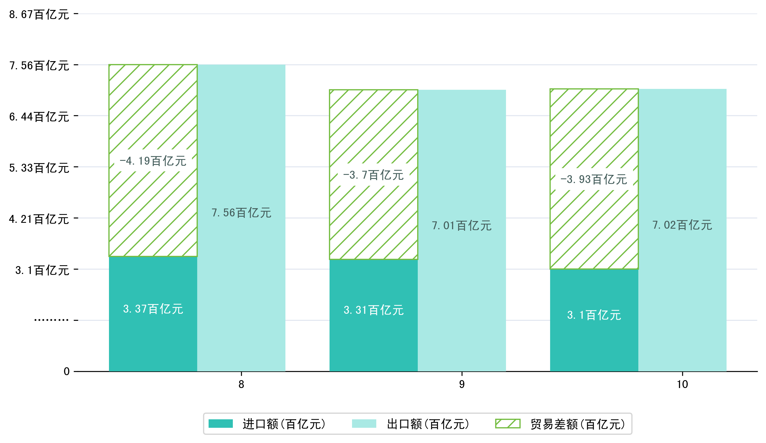 以人民币计,2025年10月广州市贸易差额为392,8647,1111万元(贸易顺差),相比上月增加了23,0293,3040万元,即3,4092,9560万美元;相比上年同期增加了105,0356,7084万元,同比增加36.49%。