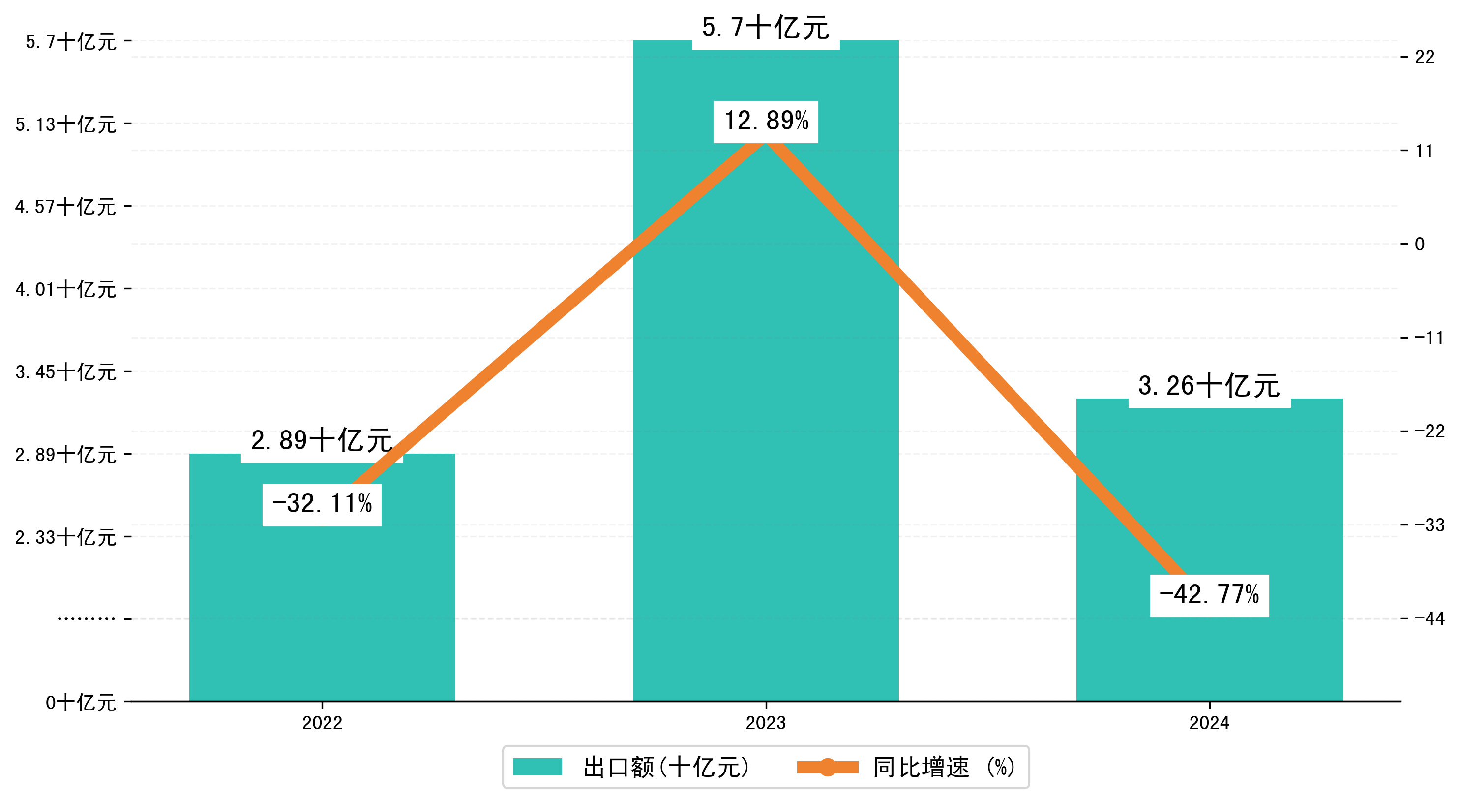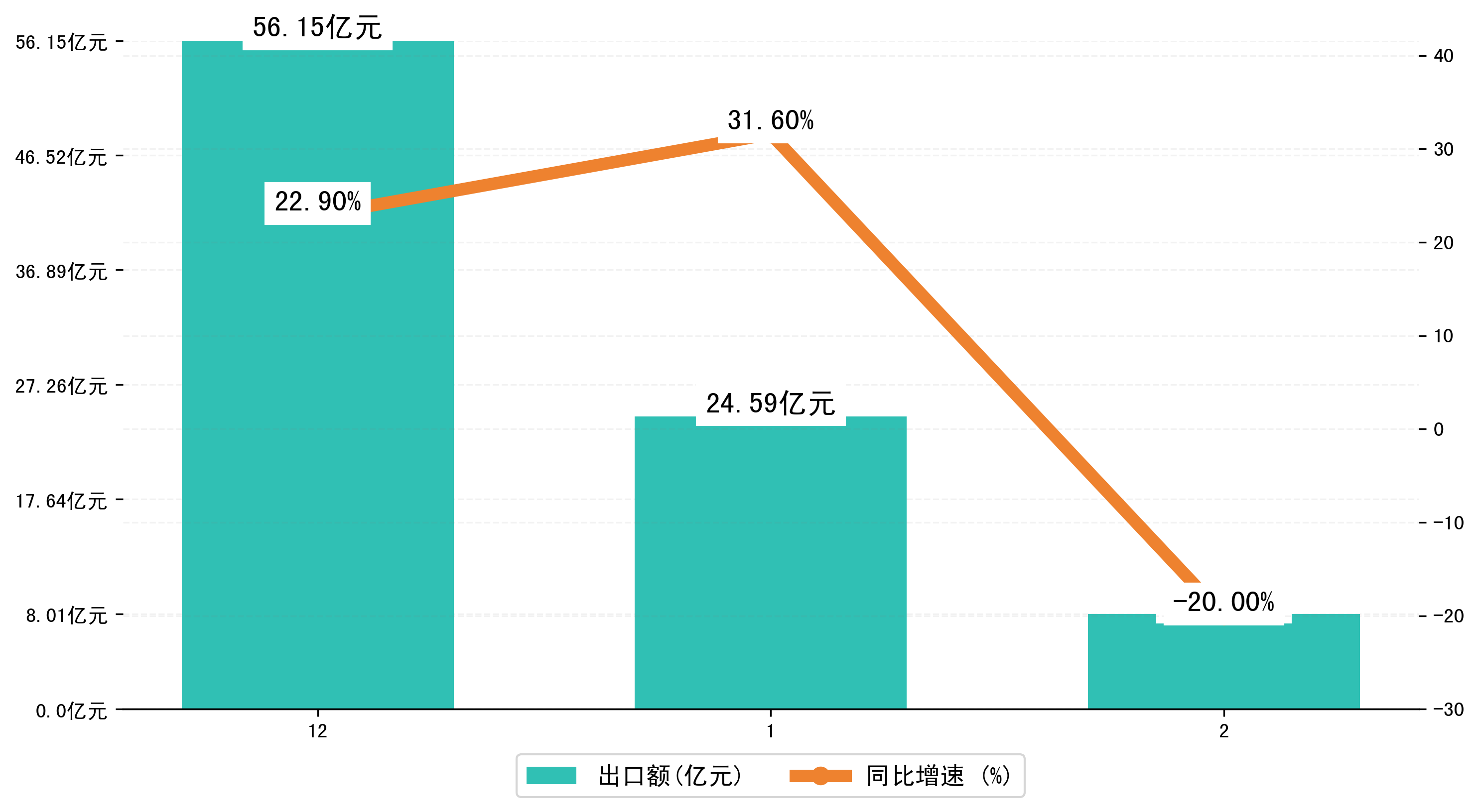 以美元计,2024年2月贵阳市出口额为1,1269.614万美元,相比上月减少了2,3160.1689万美元;相比上年同期减少了2,4318.7178万美元,同比减少-22.80%。