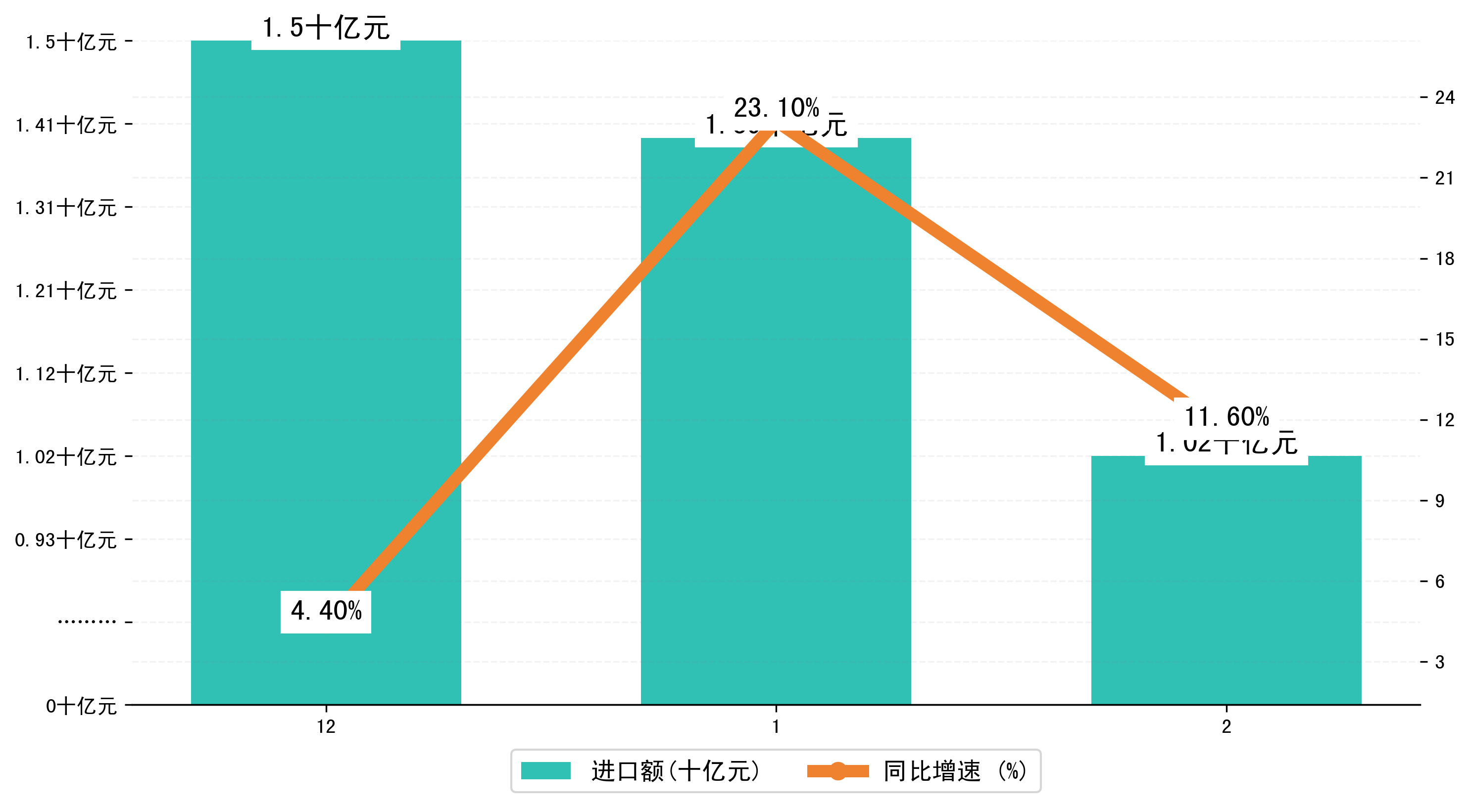 以美元计,2024年1-2月贵阳市进口额为3,3977.9463万美元,相比上年同期增加了1716.7831万美元,同比增加8.20%。