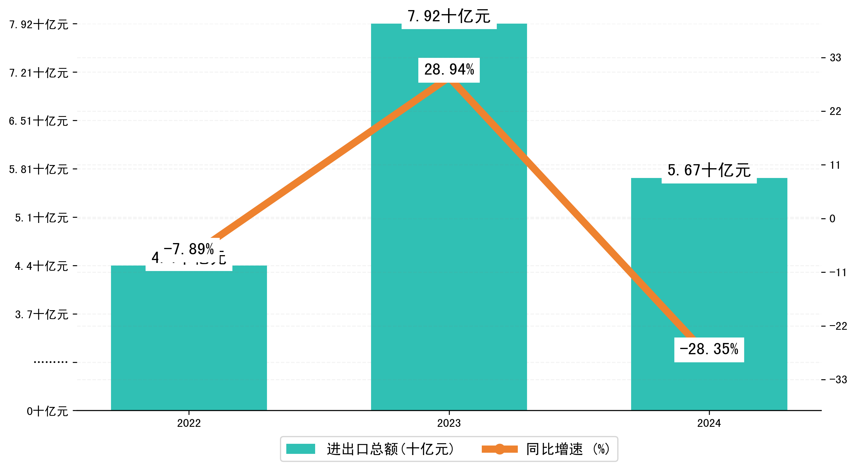 以美元计,2024年1-2月贵阳市进出口总额为7,9677.3432万美元,相比上年同期减少了3,5023.7228万美元,同比减少-12.10%。