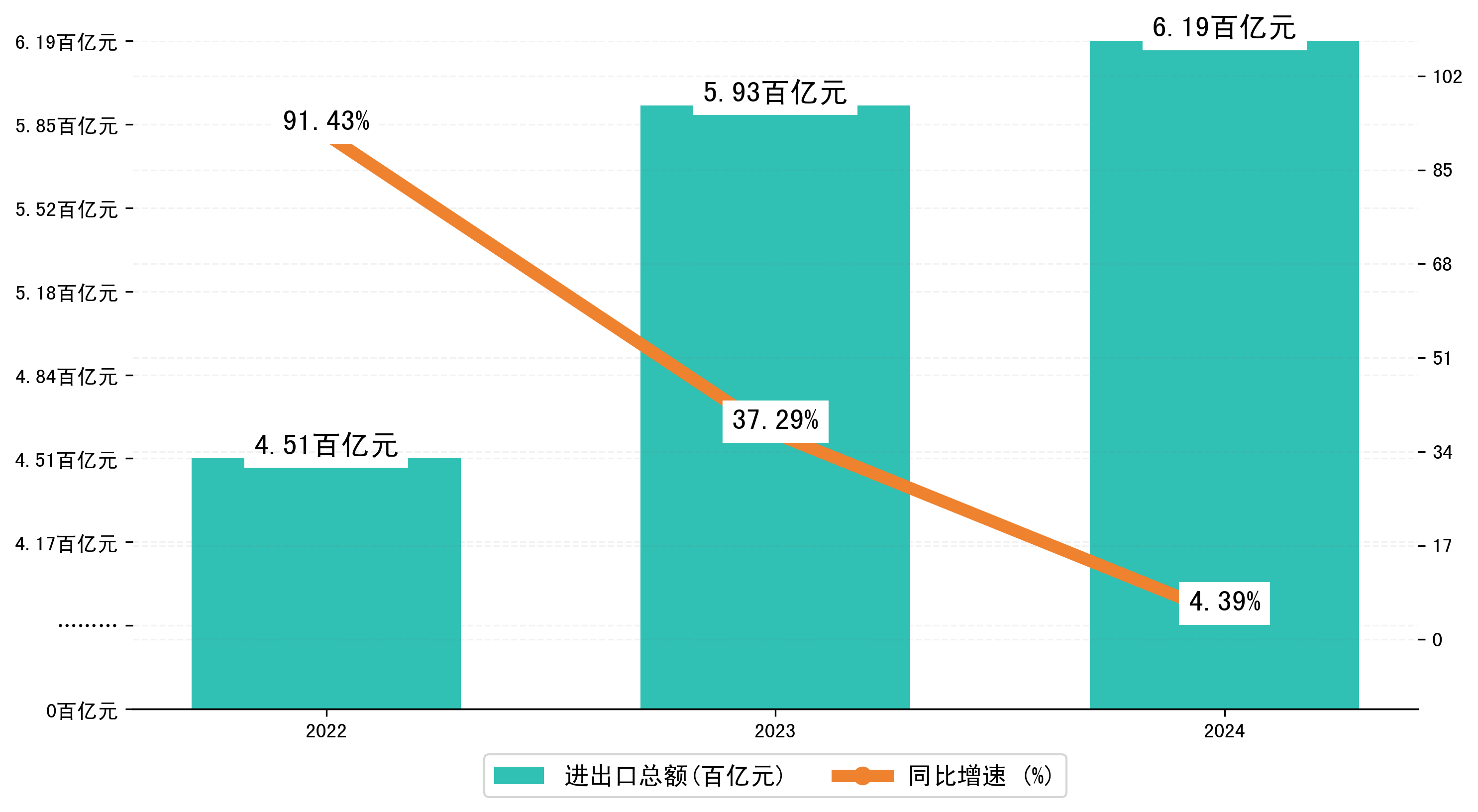 以人民币计,2024年1-9月海口市进出口总额为618,7589.1515万元,相比上年同期增加了26,0401.8211万元,同比增加了4.40%。