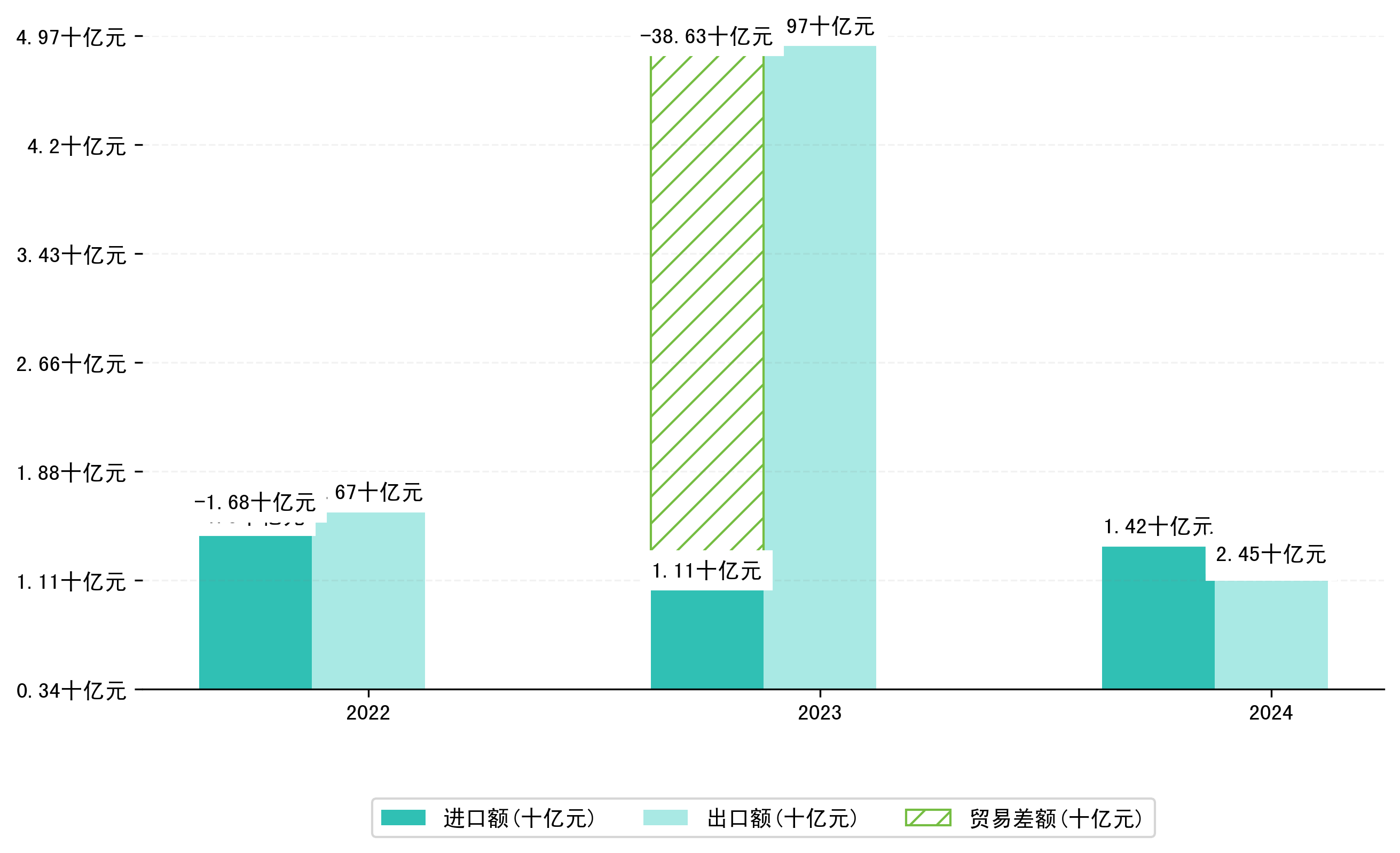 以人民币计,2024年1月衡阳市贸易差额为2,4509,6450万元(贸易逆差),相比上月减少了3,9027,8681万元,即5469,9570万美元;相比上年同期减少了41,0852,6727万元,同比减少-106.34%。