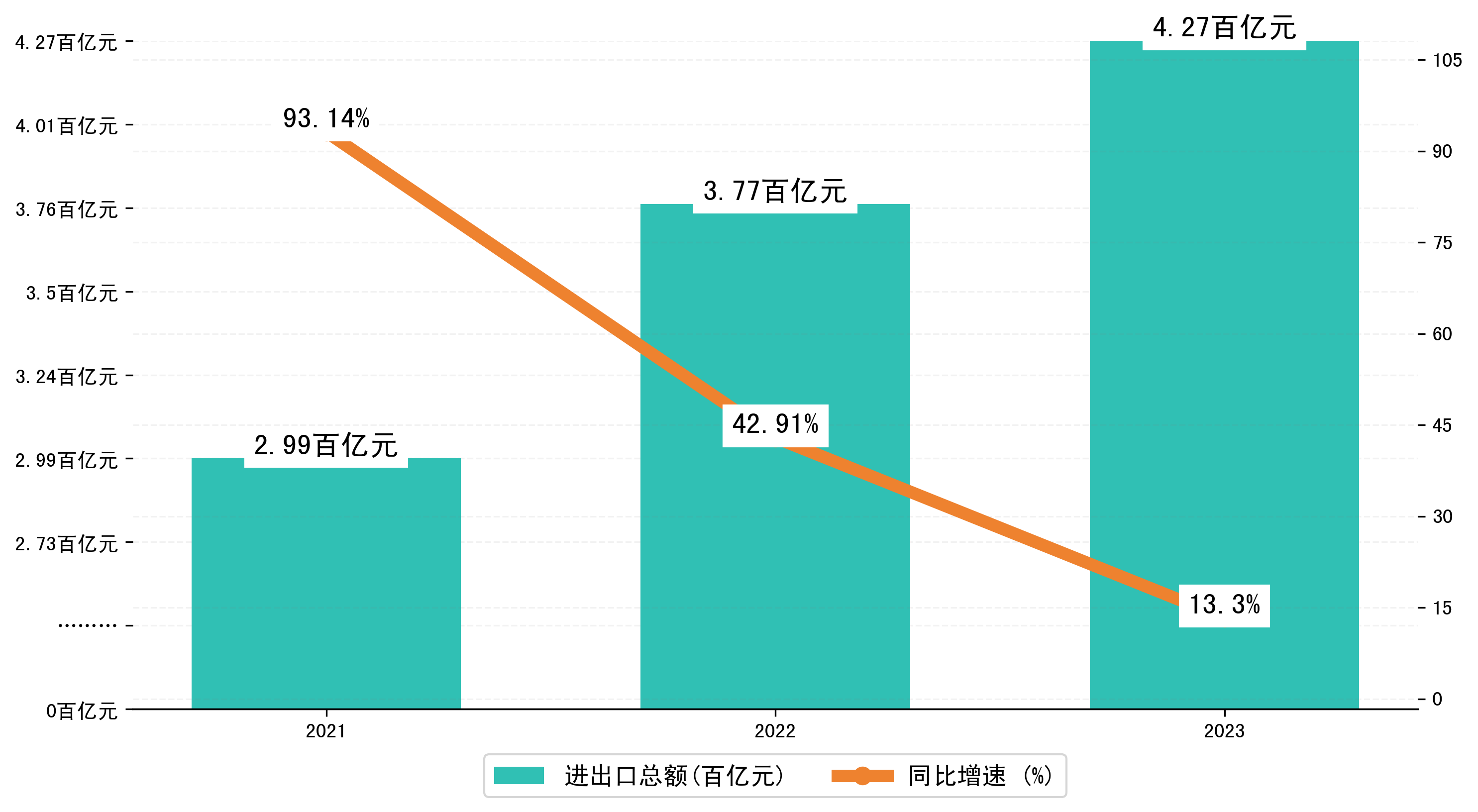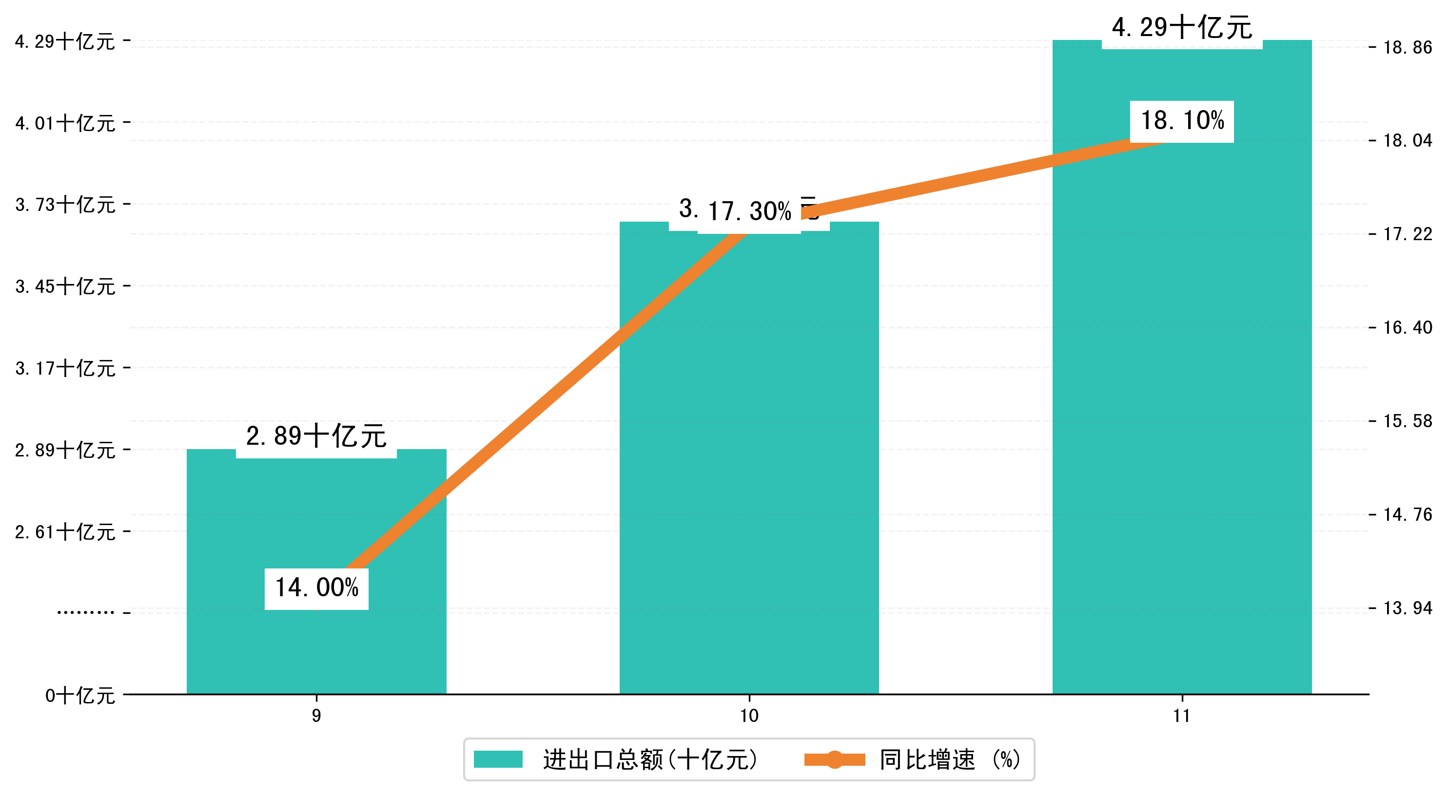以人民币计,2023年1-11月黄石市进出口总额为426,9773.5789万元,相比上年同期增加了50,1253.2112万元,同比增加了18.10%。