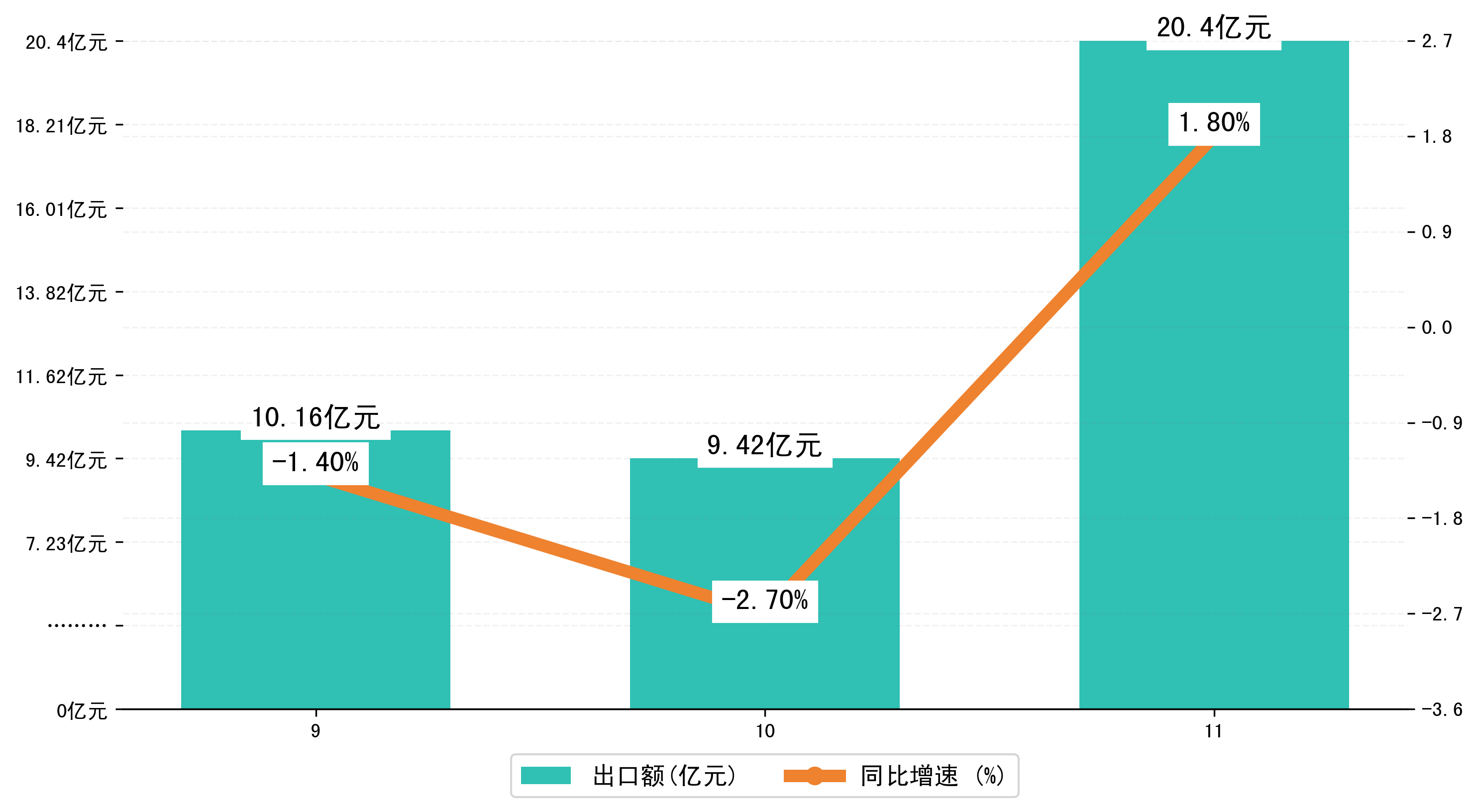 以人民币计,2023年11月黄石市出口额为20,4033.5489万元,相比上月增加了10,9801.1928万元;相比上年同期增加了7,7123.7327万元,同比增加了1.80%。