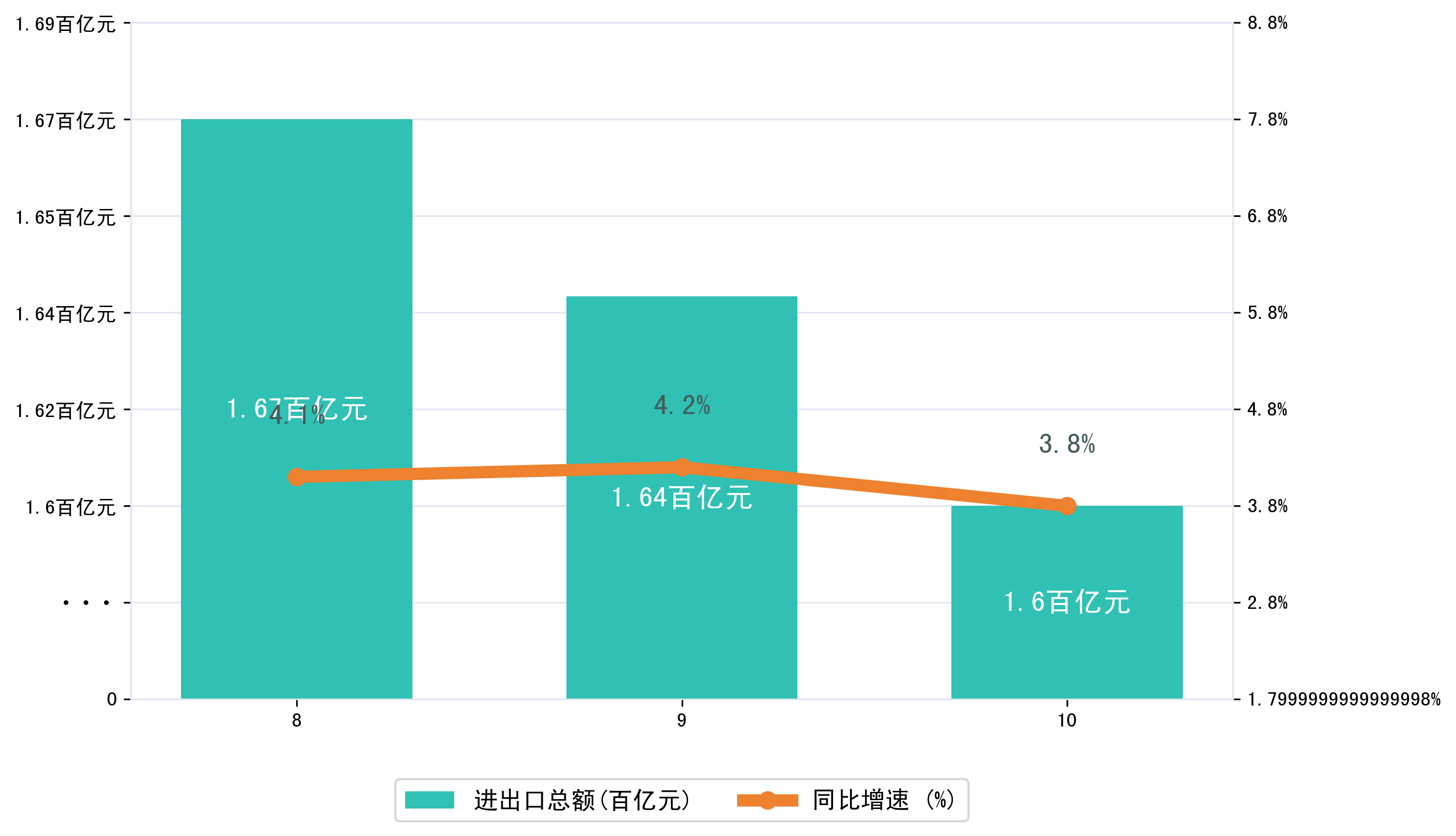 以人民币计,2025年1-10月江门市进出口总额为1631,0857.8332万元,相比上年同期增加了58,6965.3443万元,同比增加了3.80%。