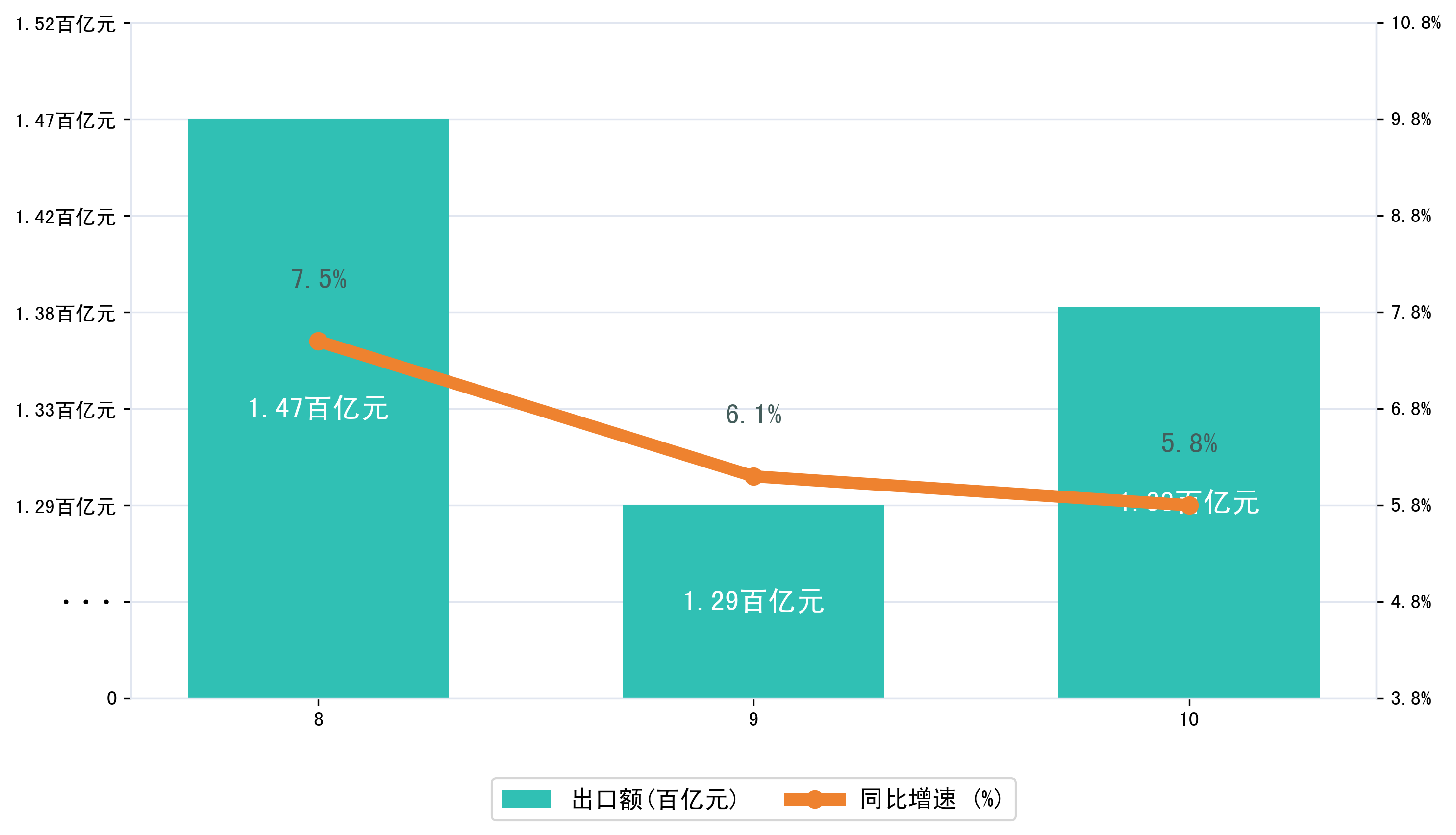 以人民币计,2025年10月江门市出口额为138,1100.2415万元,相比上月增加了9,3871.999万元;相比上年同期增加了3,8634.504万元,同比增加了5.80%。