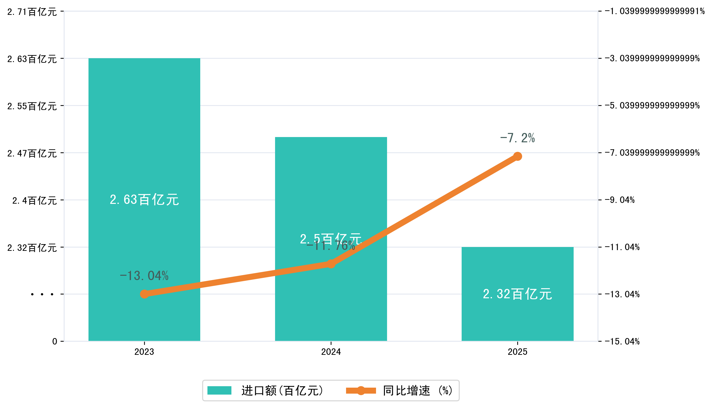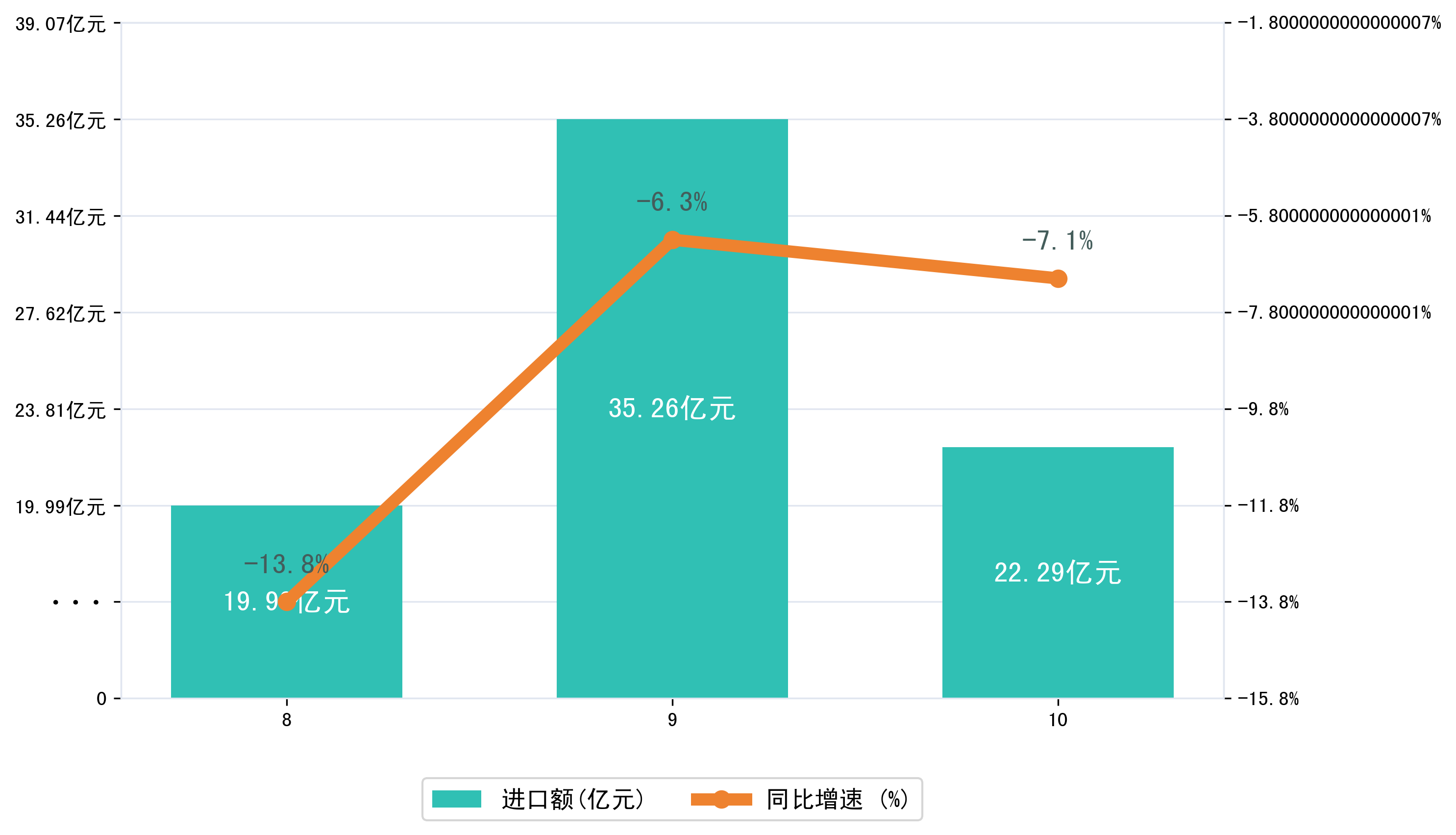 以人民币计,2025年1-10月江门市进口额为231,9535.9041万元,相比上年同期减少了17,9844.3214万元,同比减少了-7.10%。