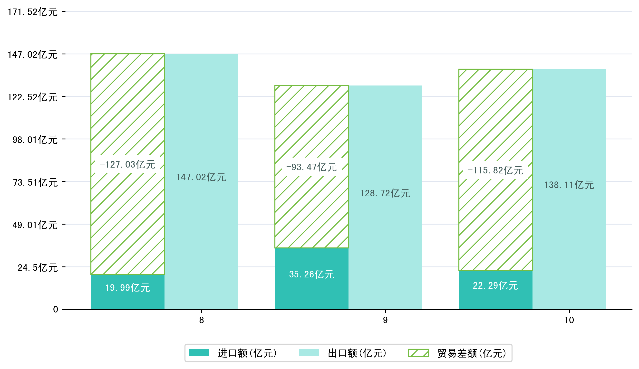 以人民币计,2025年10月江门市贸易差额为115,8221,9831万元(贸易顺差),相比上月增加了22,3566,3538万元,即3,1537,9826万美元;相比上年同期增加了7,7459,4047万元,同比增加7.17%。