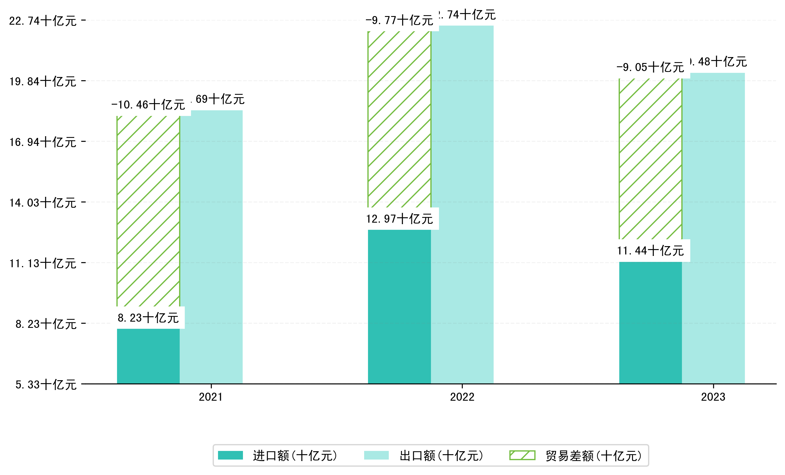 以美元计,2023年1-10月荆州市贸易差额为12,9109,5887万美元(贸易顺差),相比上年同期减少了2,0438,8181万美元,同比减少-13.67%。