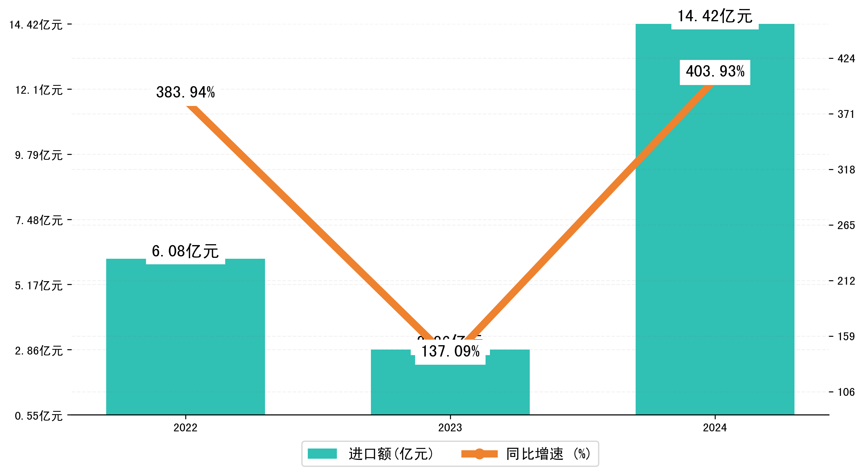 以人民币计,2024年1-12月晋中市进口额为14,4152.5819万元,相比上年同期增加了11,5546.8119万元,同比增加了403.90%。