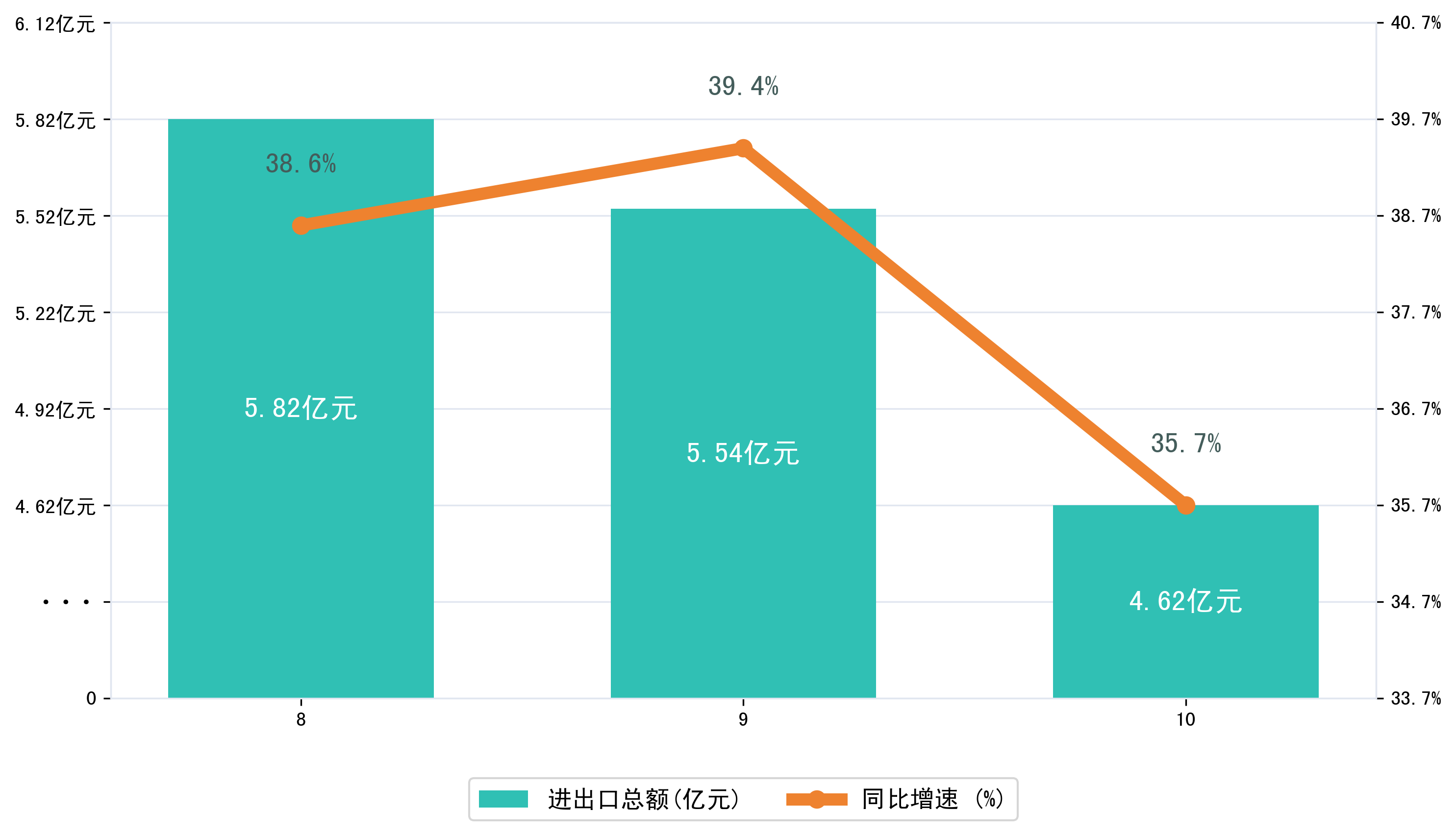 以人民币计,2025年10月晋中市进出口总额为4,6234.8267万元,相比上月减少了9204.8482万元;相比上年同期增加了2418.5242万元,同比增加了35.70%。