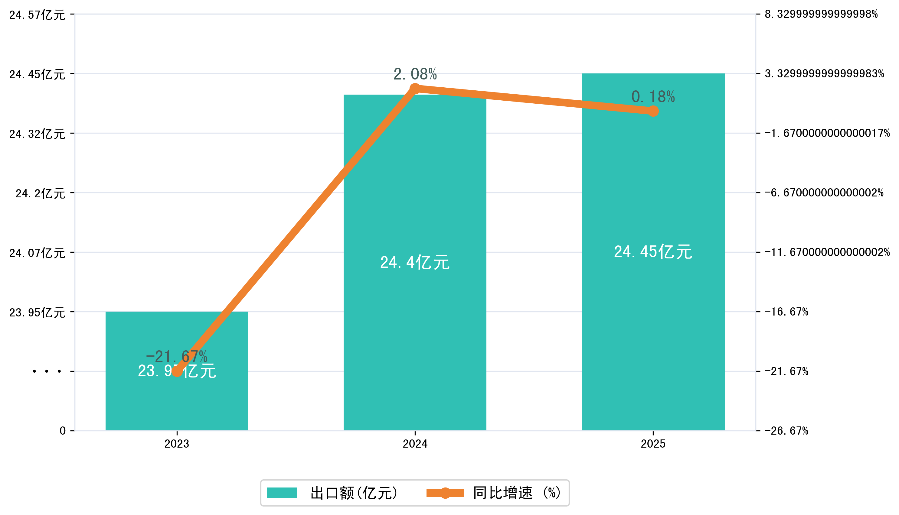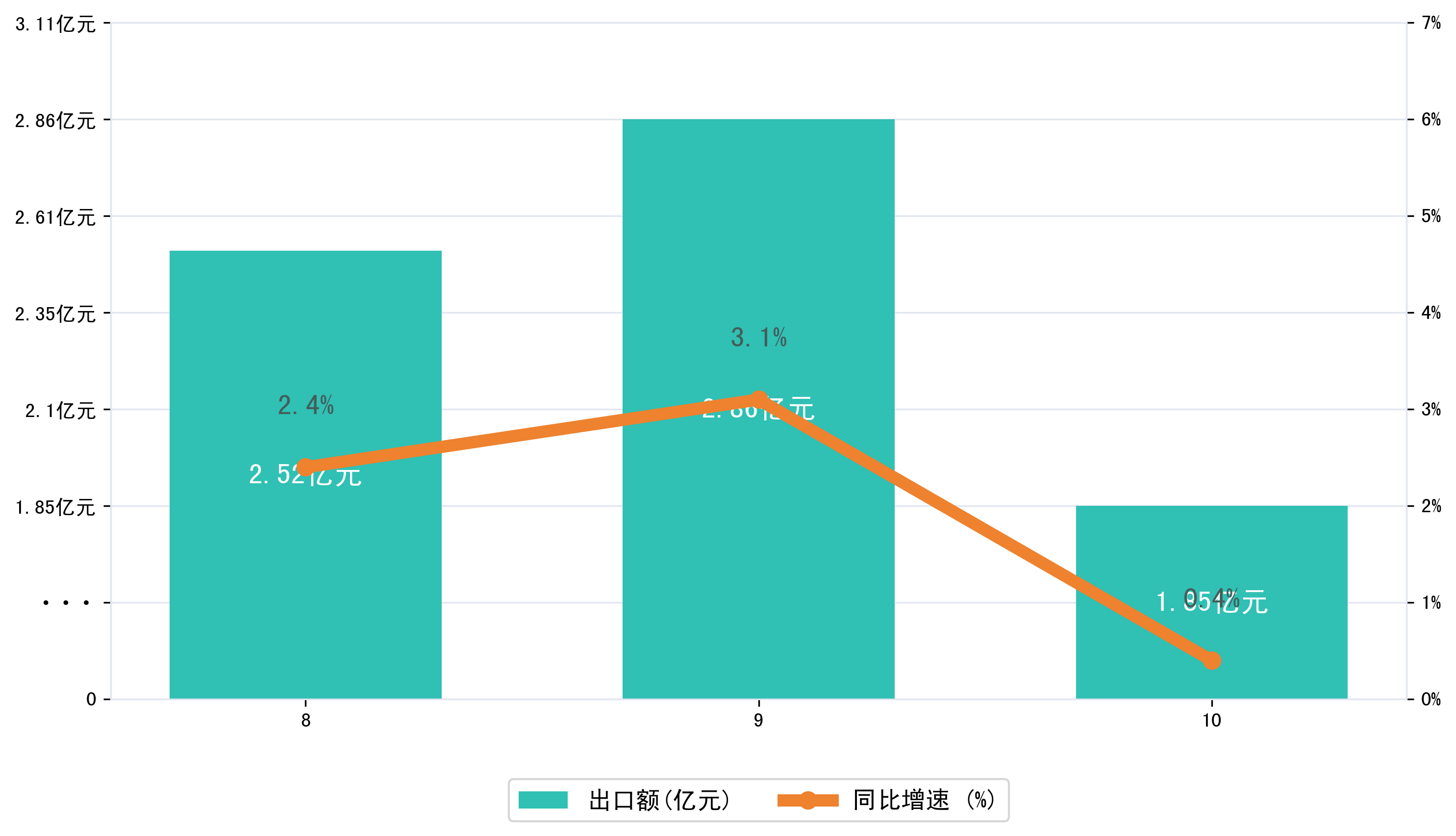 以人民币计,2025年1-10月晋中市出口额为24,4456.1648万元,相比上年同期增加了438.788万元,同比增加了0.40%。