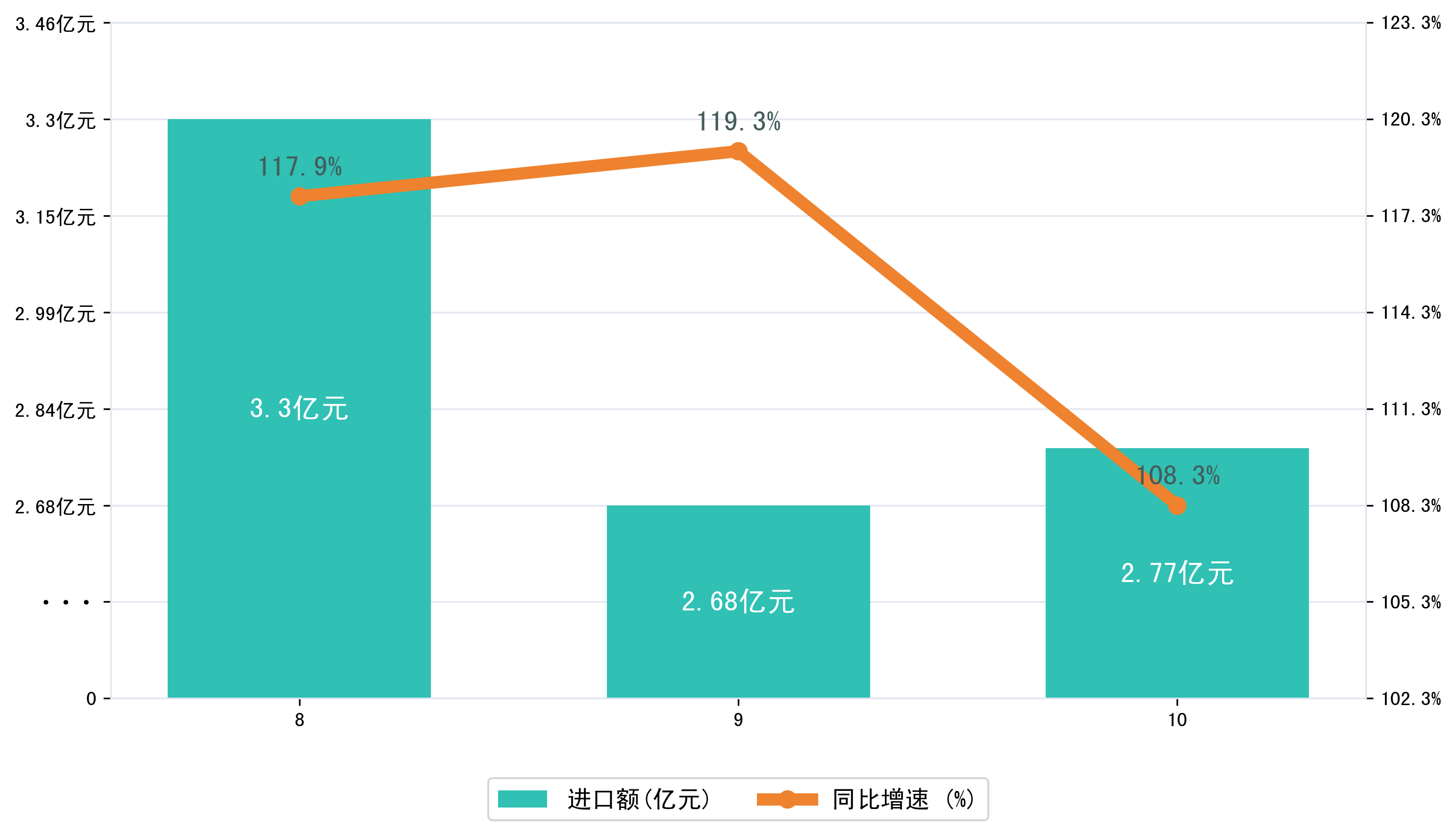 以人民币计,2025年10月晋中市进口额为2,7747.0165万元,相比上月增加了916.1551万元;相比上年同期增加了8340.6673万元,同比增加了108.30%。
